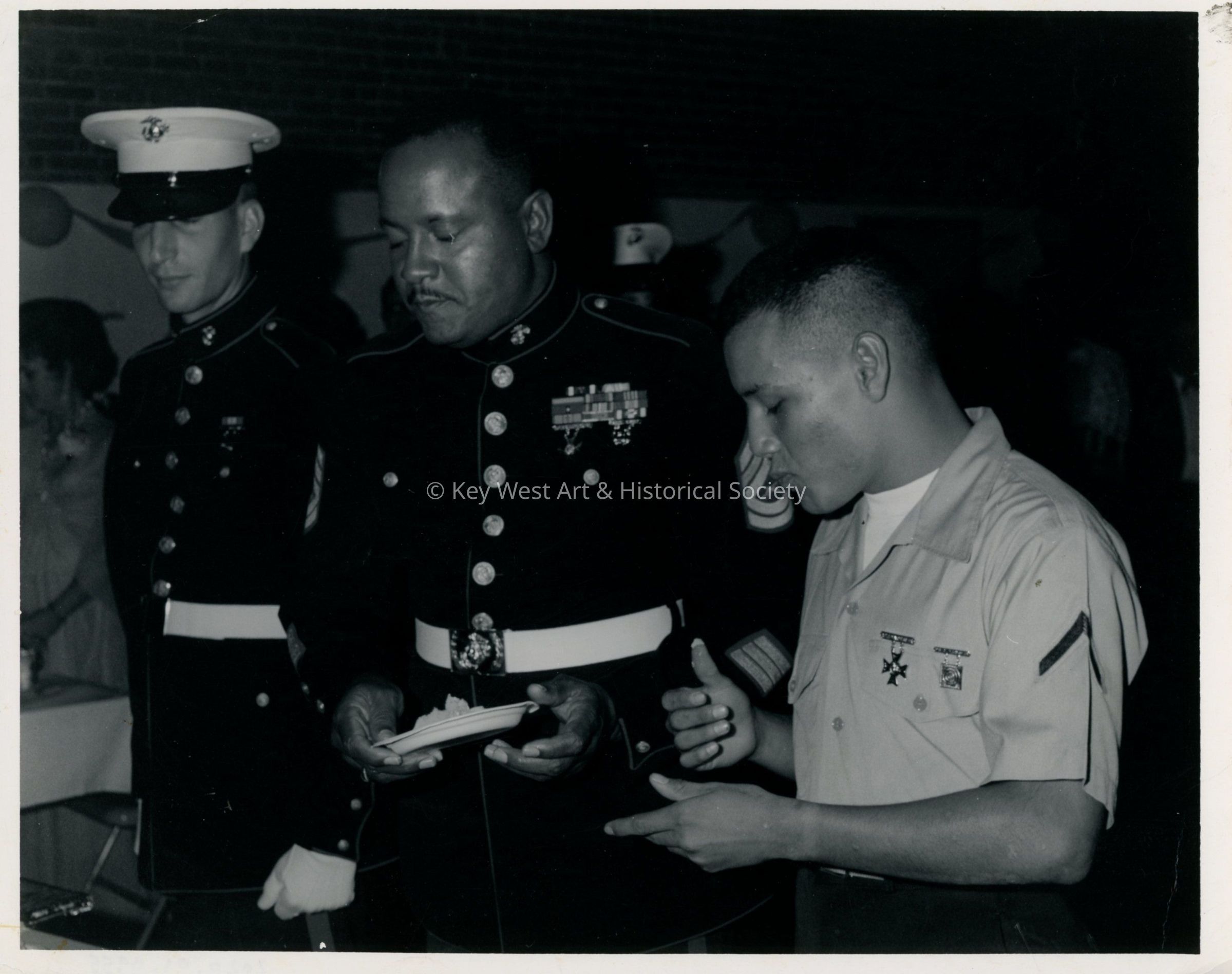 Black and white photograph of cake cutting celebrating the US Navy's birthday. Traditionally the cake is cut with a sword by the most senior and most junior sailors.