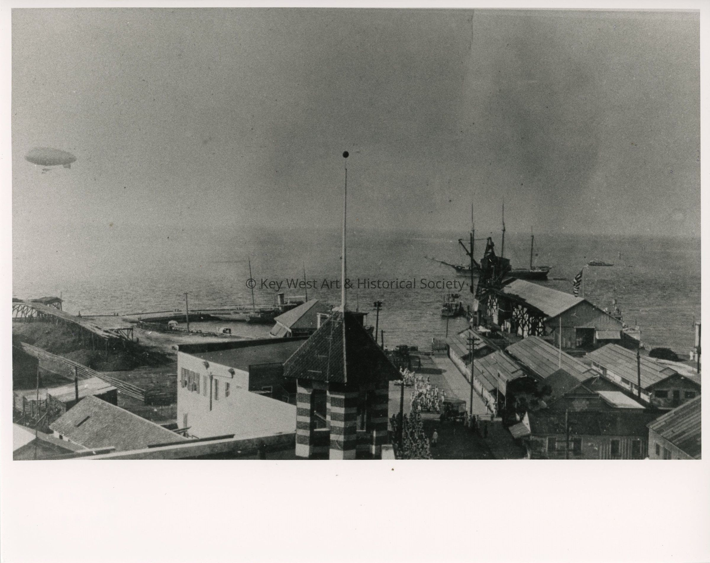 Black and white photograph from the top of the Jefferson Hotel on Duval Street looking north. A US Navy dirigible is visible on the extreme left and a ship is seen near center.