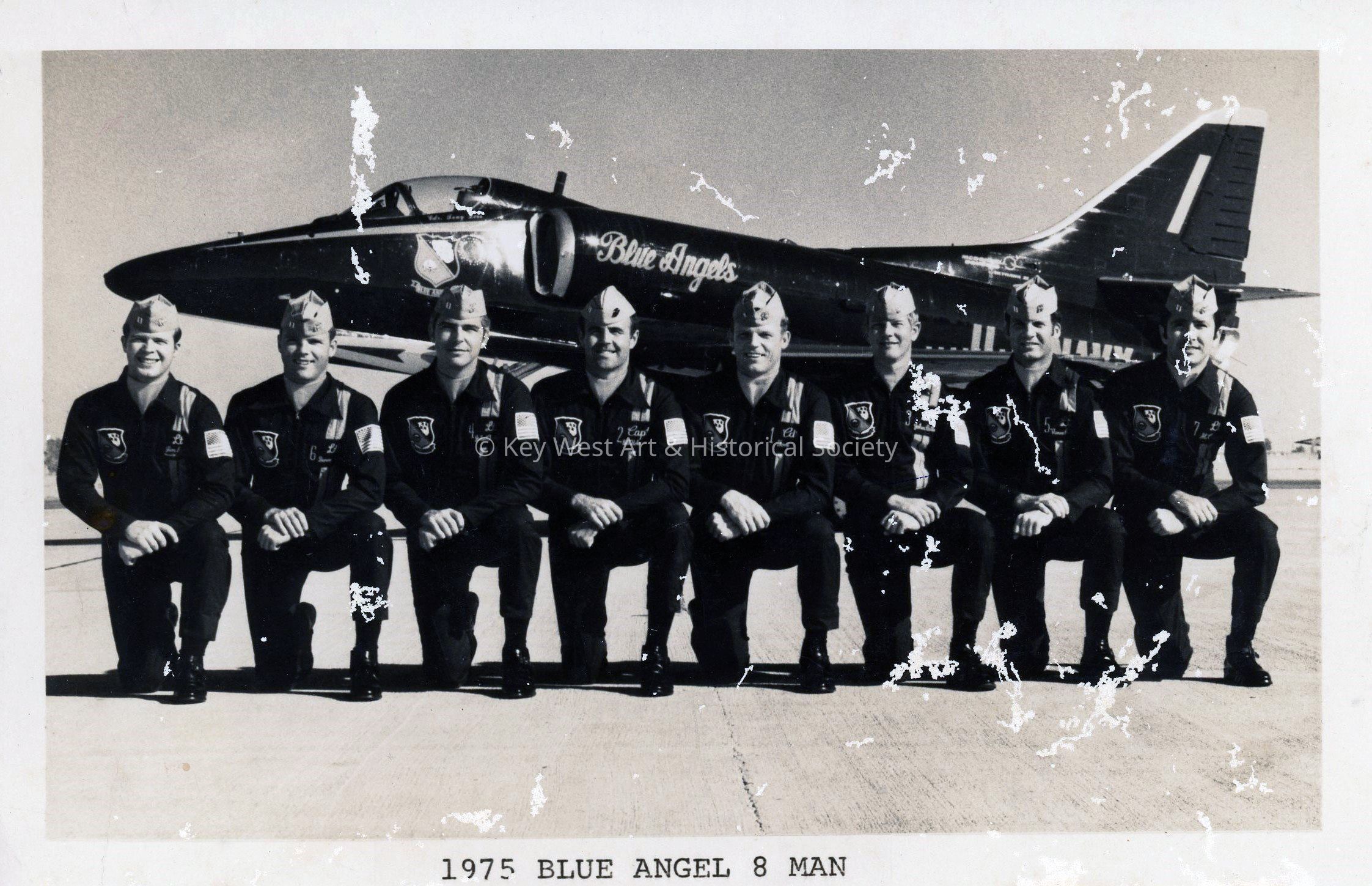 Black and white photograph of the Blue Angels at Naval Air Station Key West in 1975.
