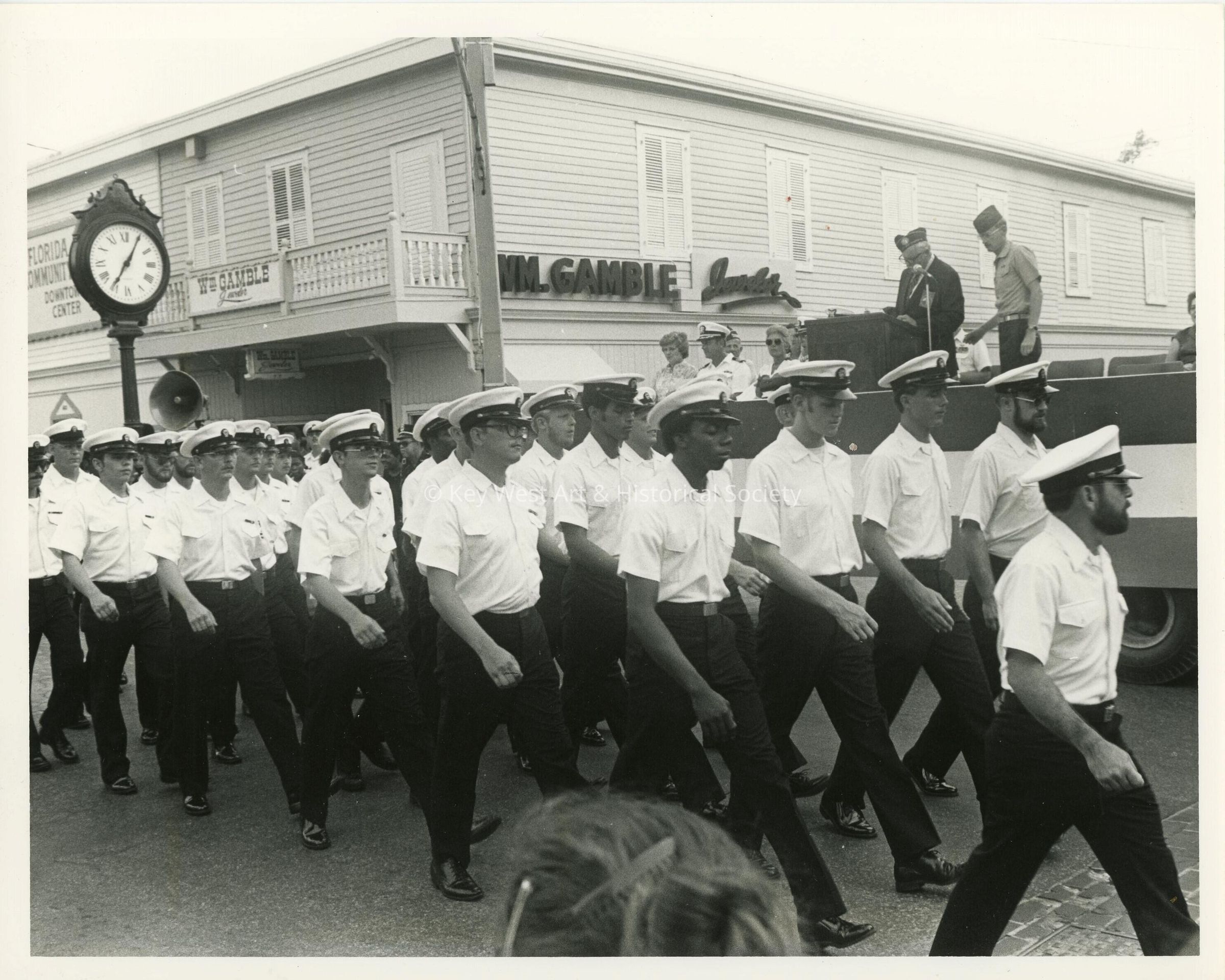 Black and white photograph of US Navy personnel walking in a parade passing William Gamble Jewelers at 600 Duval Street.