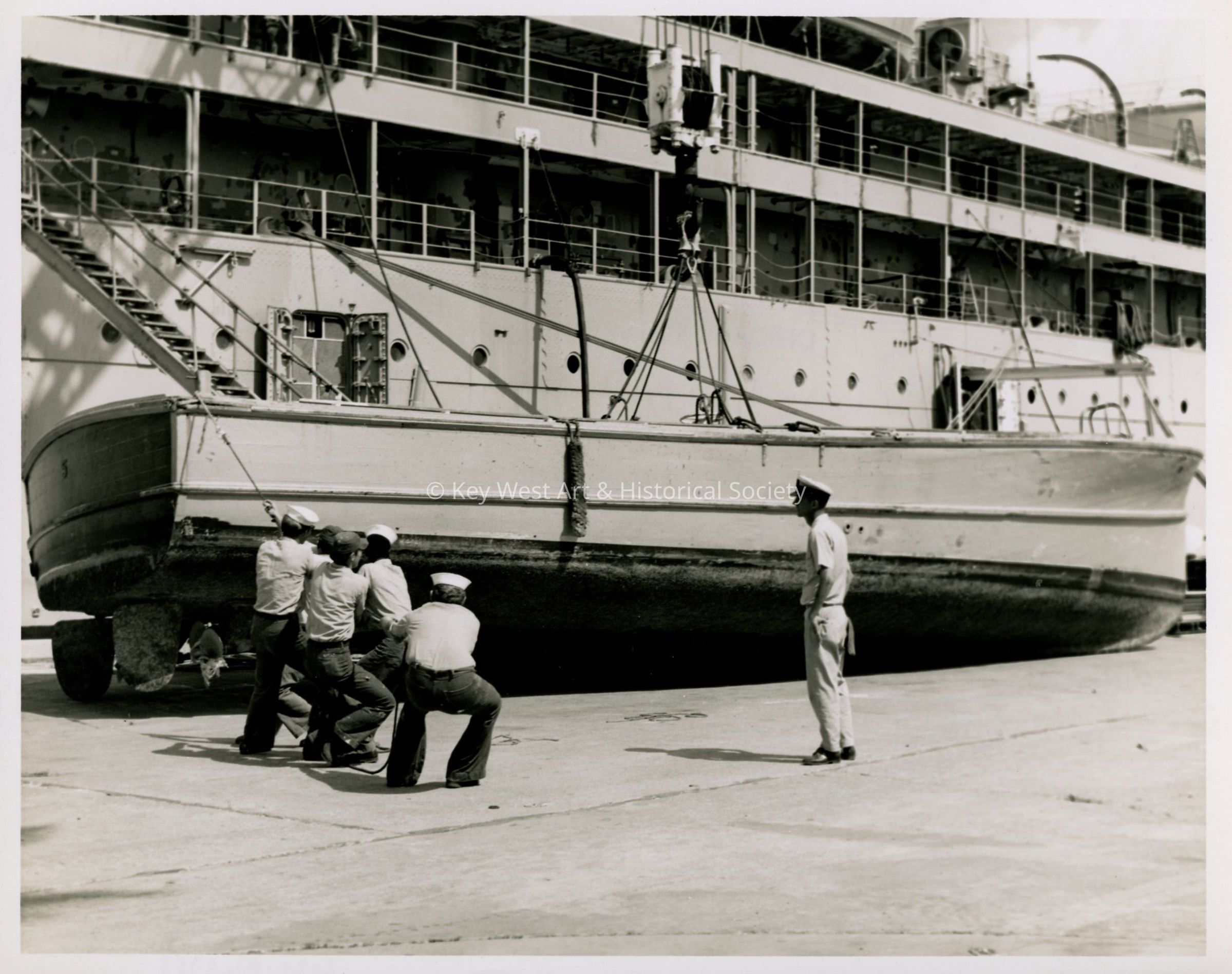 Black and white photograph of US Navy personnel performing duties pier side at Naval Station Key West.