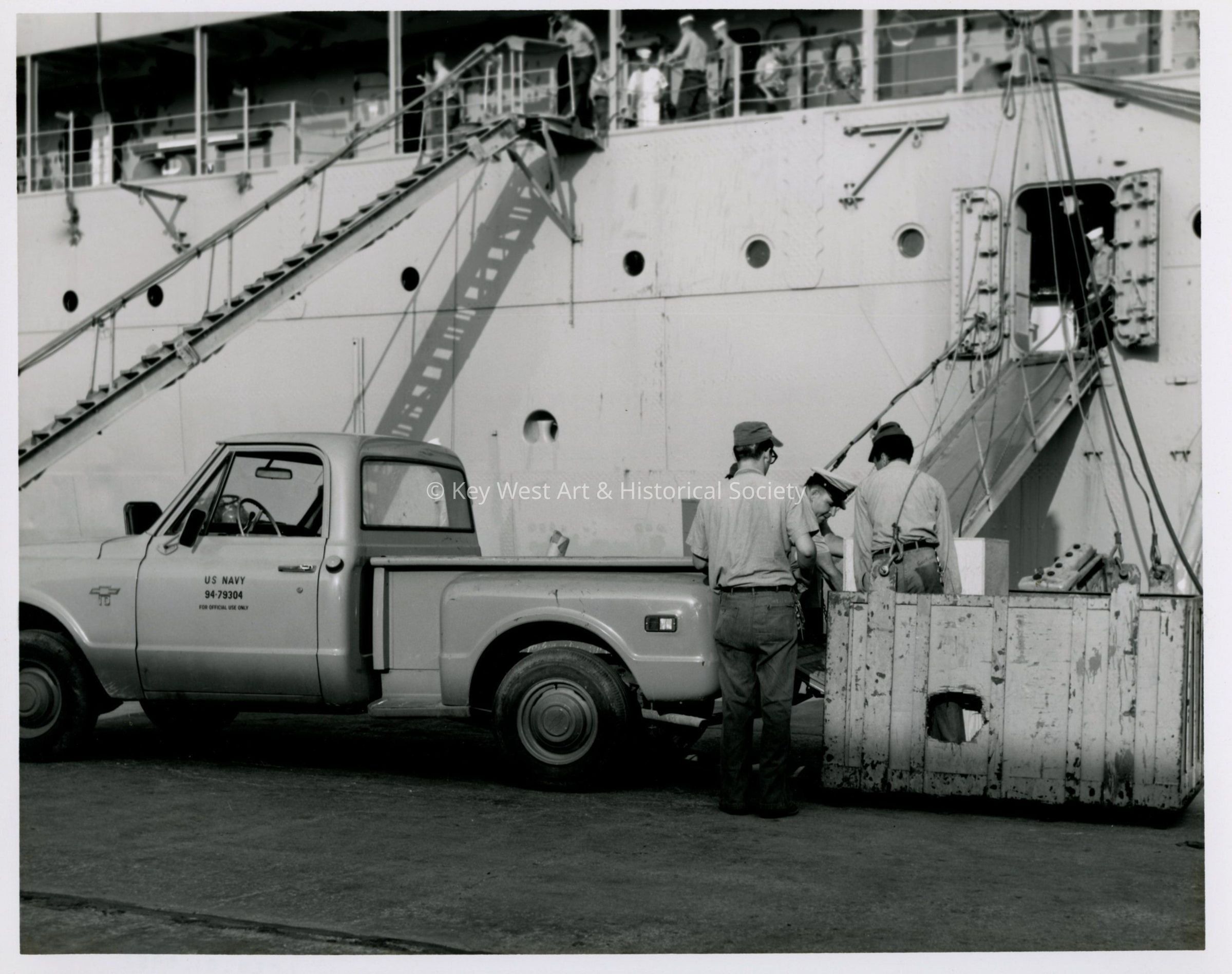 Black and white photograph of US Navy personnel performing duties pier side at Naval Station Key West during the Navy Day open house.