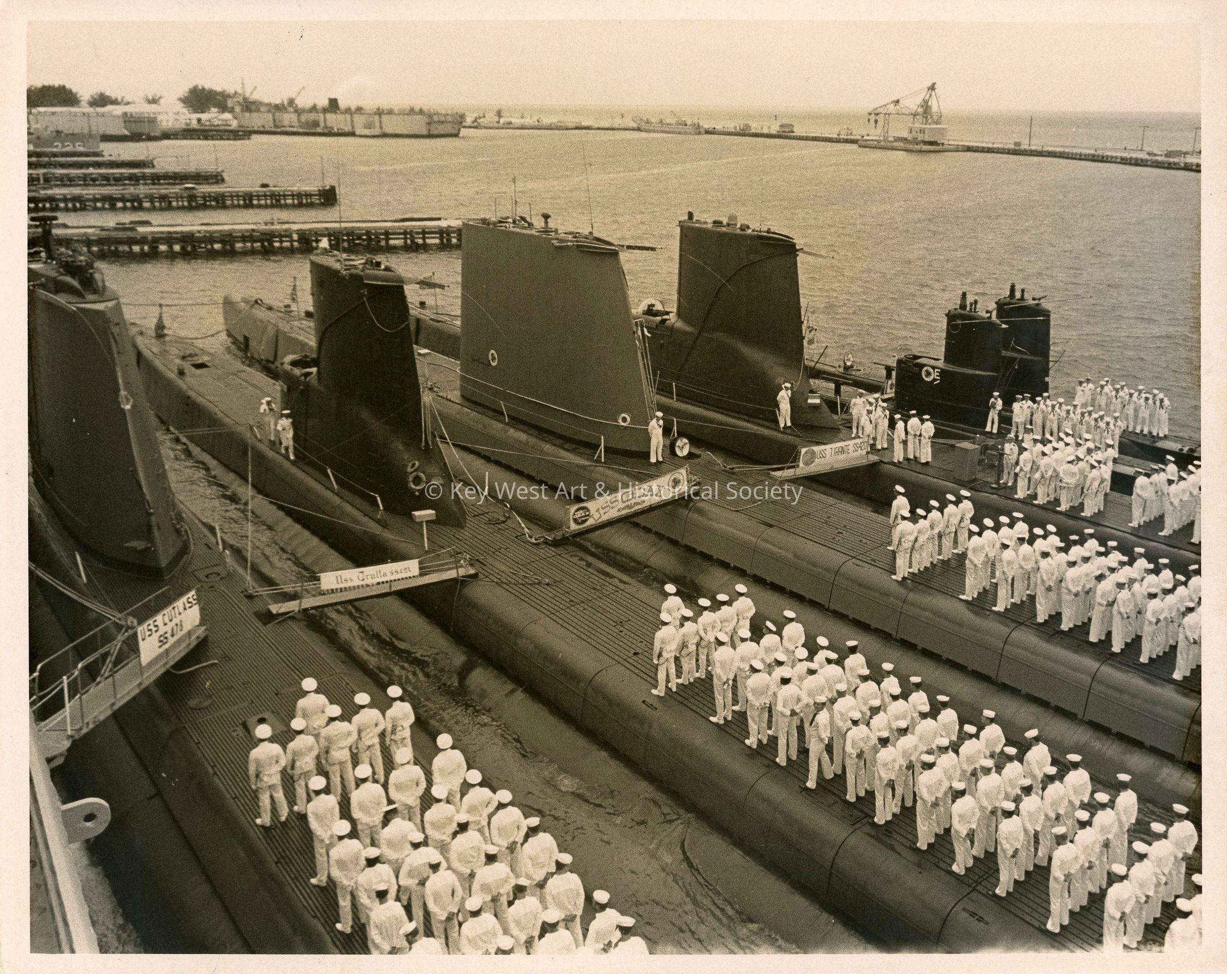 Black and white photograph several US Navy submarines docked at Naval Station Key West including USS TIRANTE (SS-420), USS ODAX (SS-484), USS TRUTTA (SS-421), and USS CUTLASS (SS-478).Photograph Details