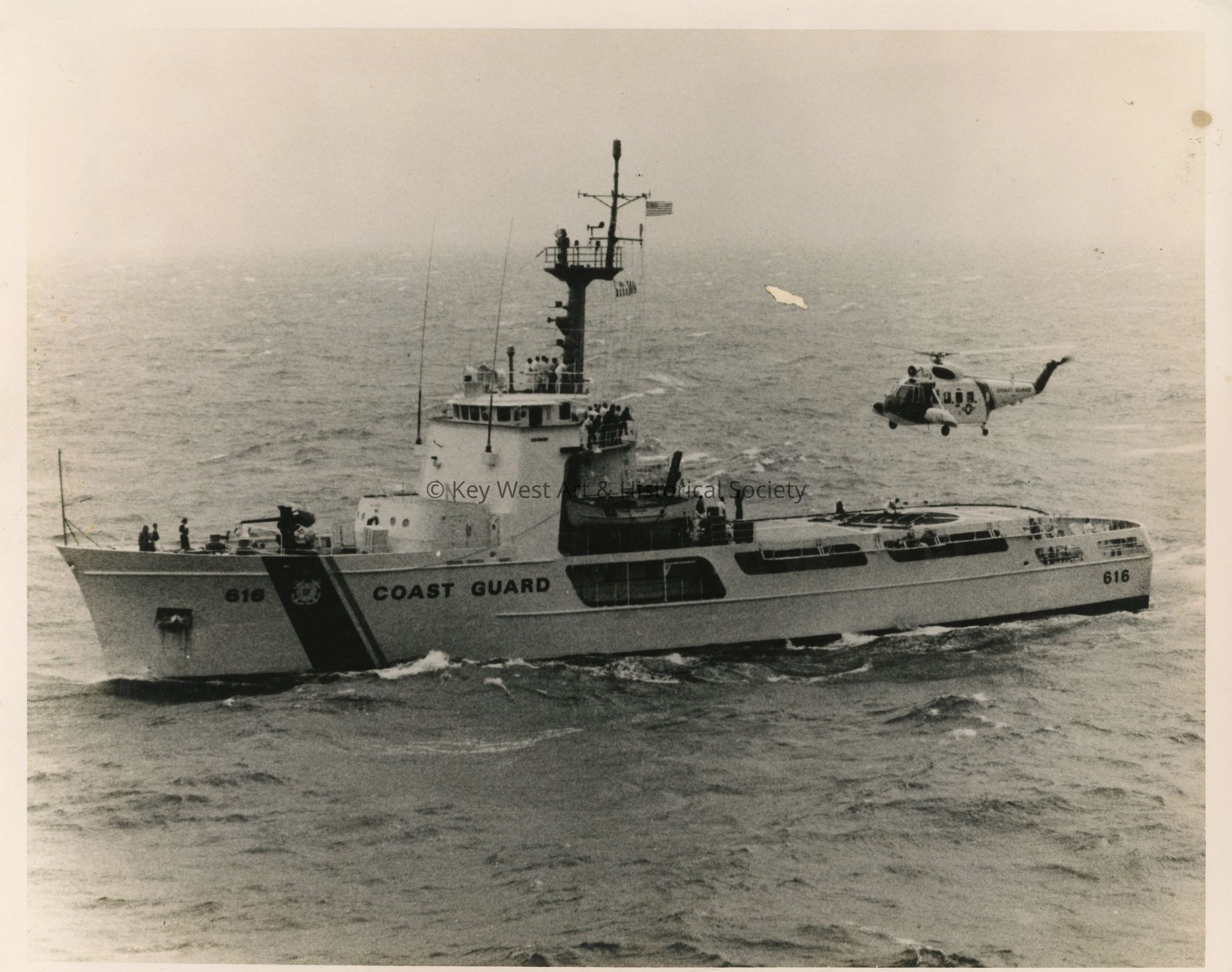 Black and white photograph of the USCGC DILIGENCE (WMEC-616) with a USCG helicopter landing on its deck.