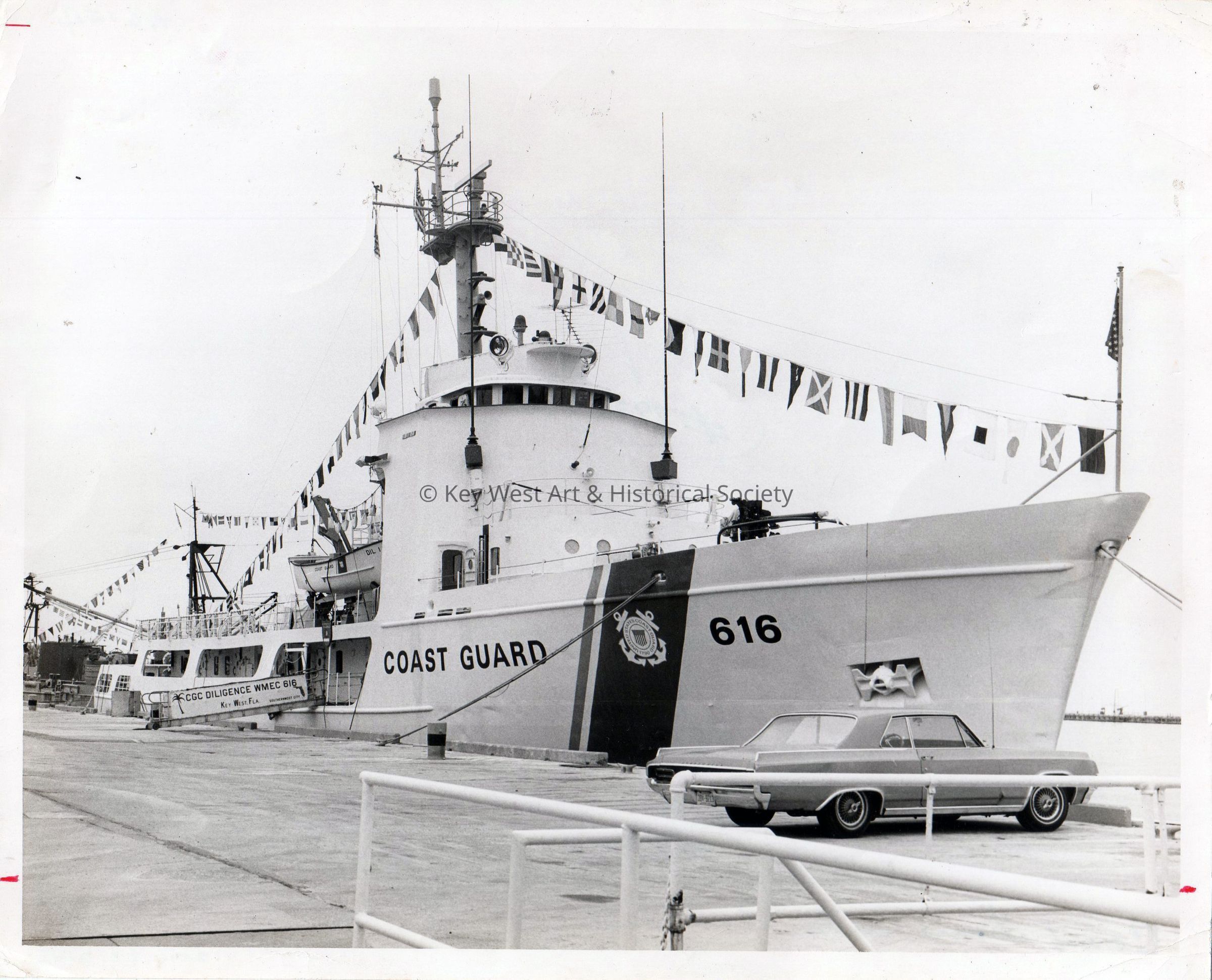 Black and white photograph of the United States Coast Guard Cutter DILIGENCE (616) docked in Key West.