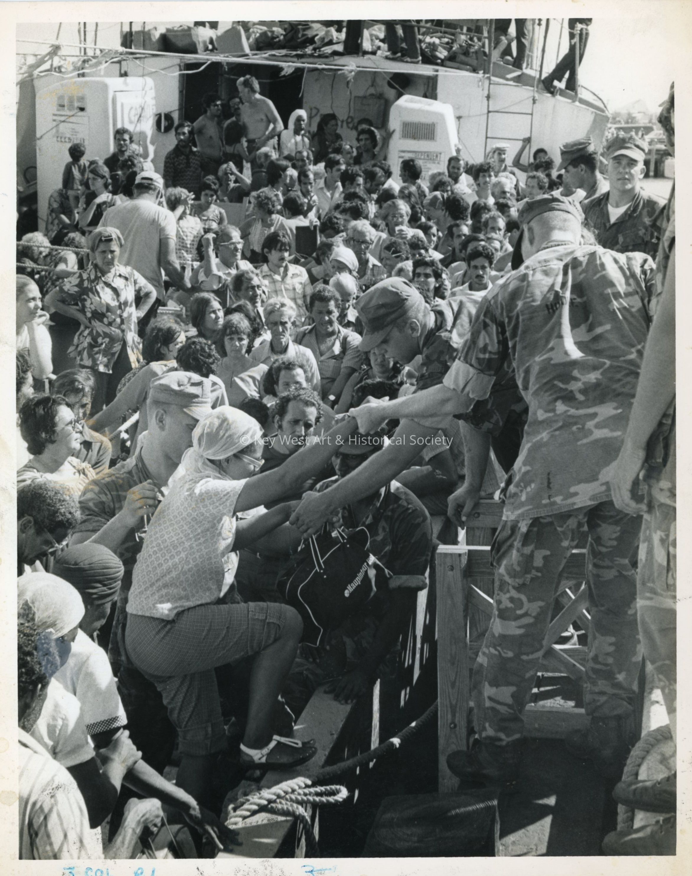 Black and white photograph of U.S. Marines helping refugees to disembark a vessel coming from Mariel harbor.