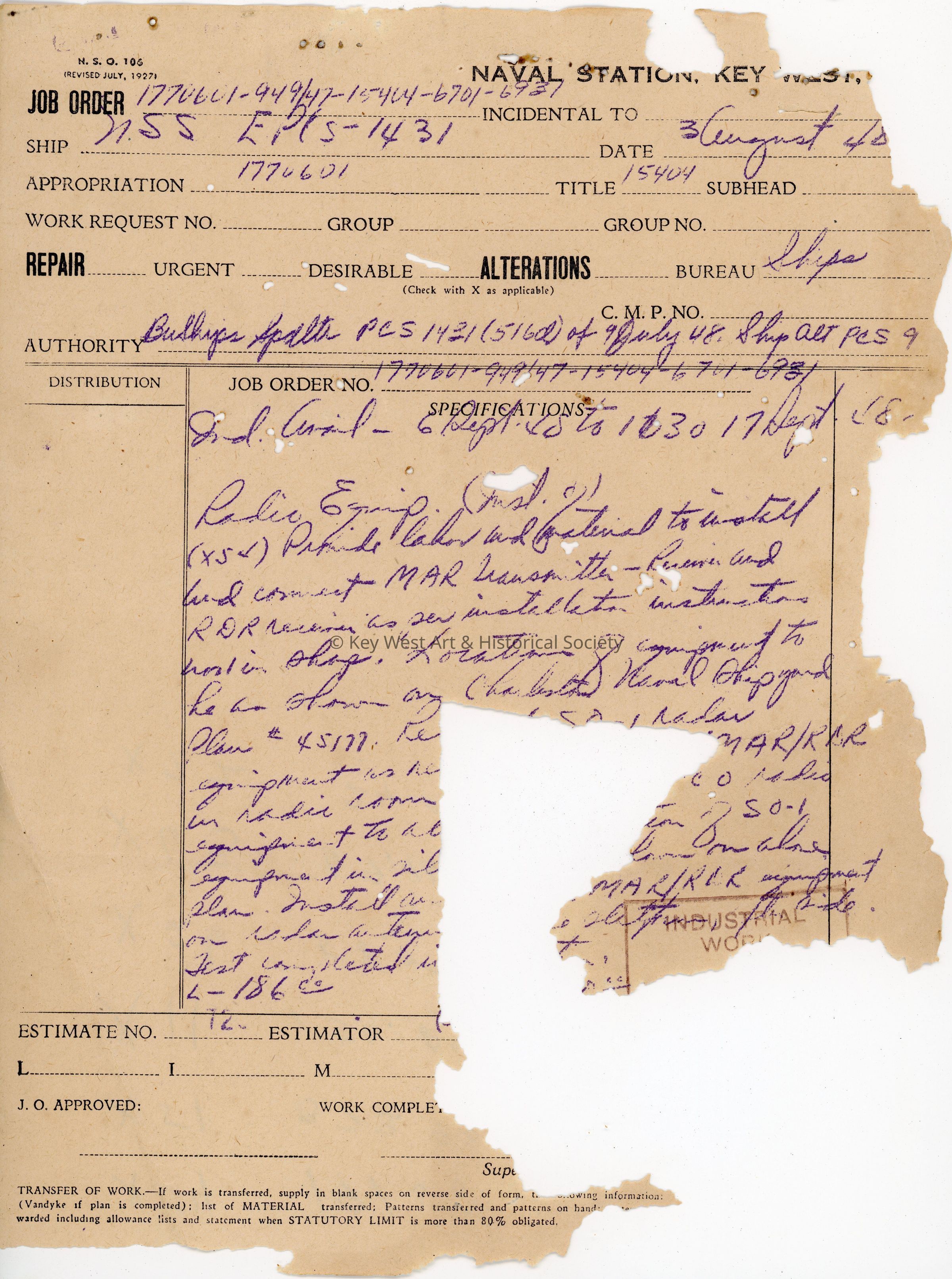 Copy of a United States Navy Job Order form for the installation of MAR/RDR equipment including radar and radio aboard the USS EPCS-1431 at Naval Station Key West. Page has an 'Industrial Work Progress' stamp. Page 1/3.