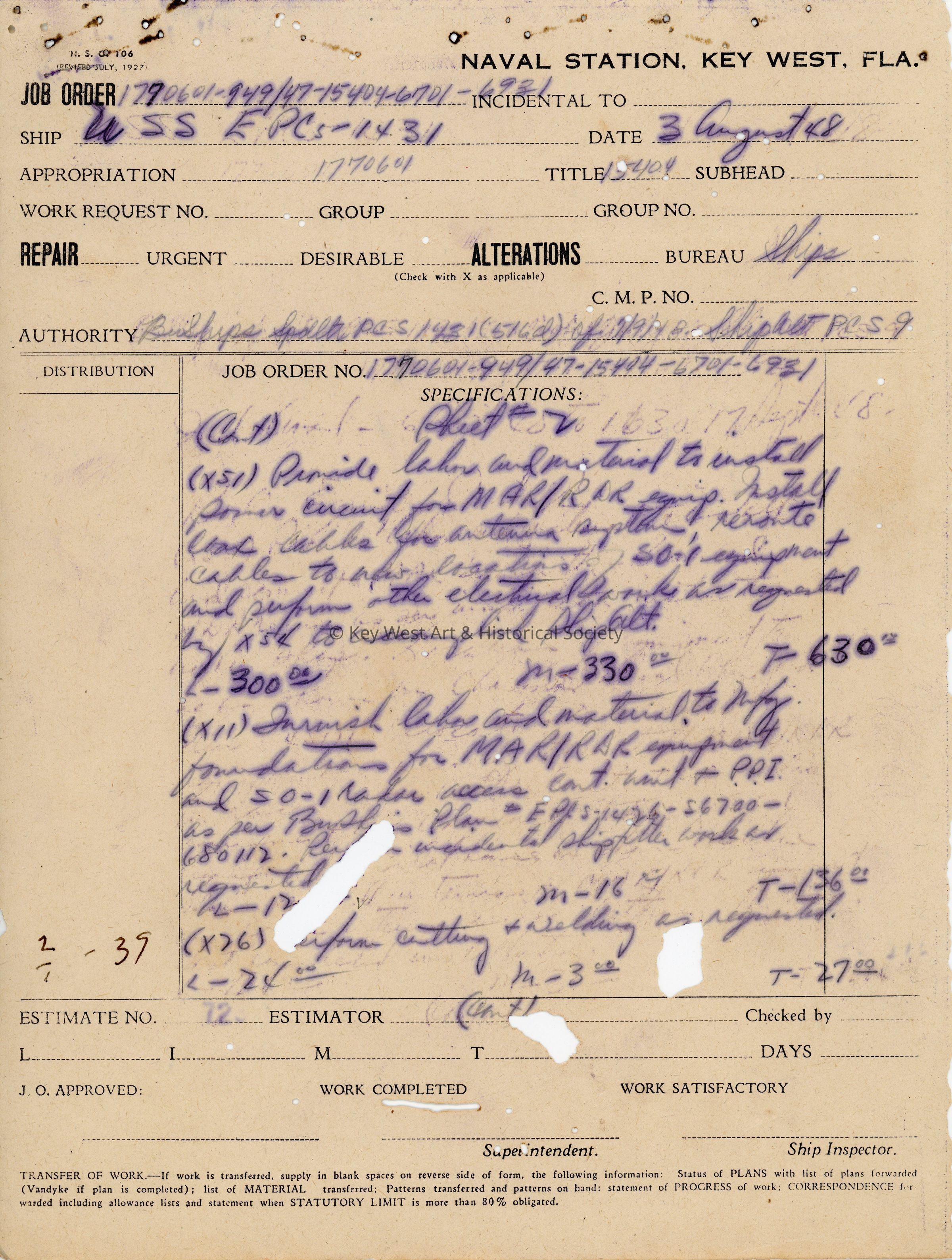 USS EPCS-1431 Job Order: © Key West Art & Historical Society