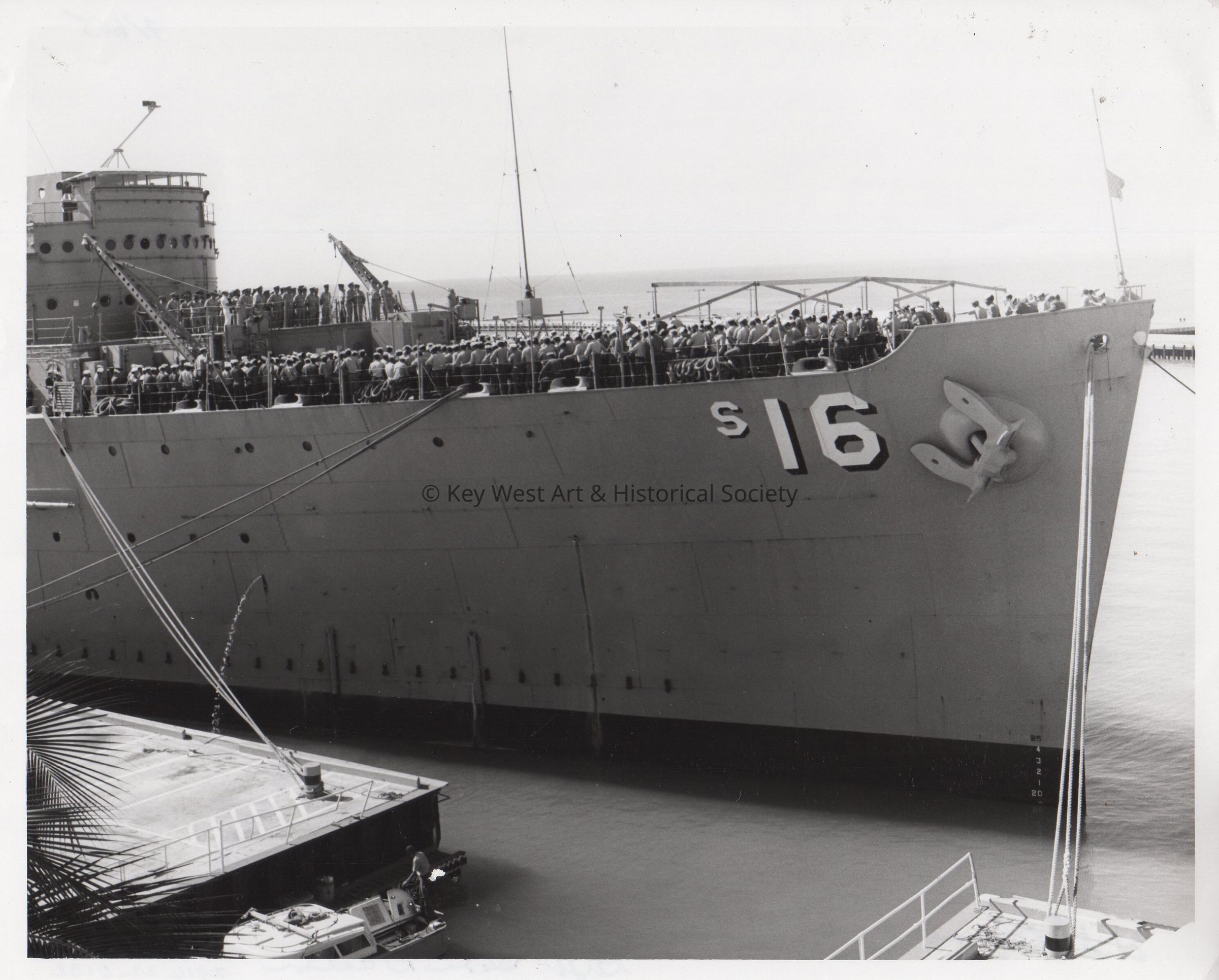 Black and white photograph of the submarine tender USS HOWARD W. GILMORE (AS-16) docked at Naval Station Key West.
