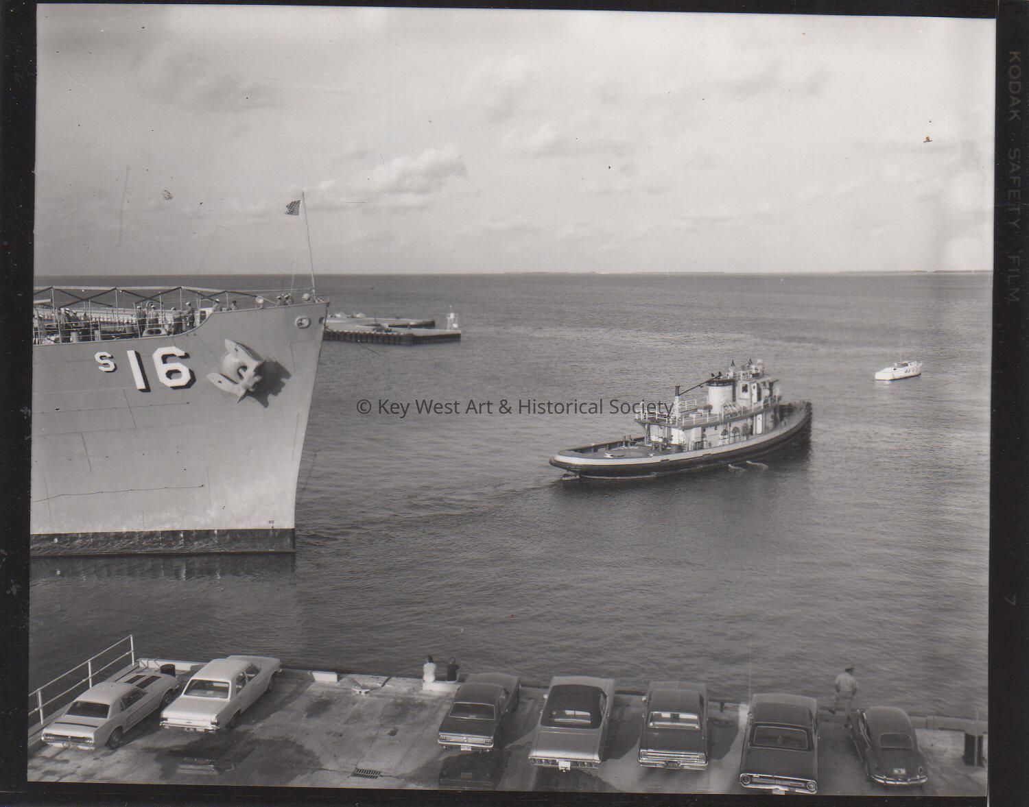 Black and white photograph of bow section of the submarine tender USS HOWARD W. GILMORE (AS-16) docked at Naval Station Key West.