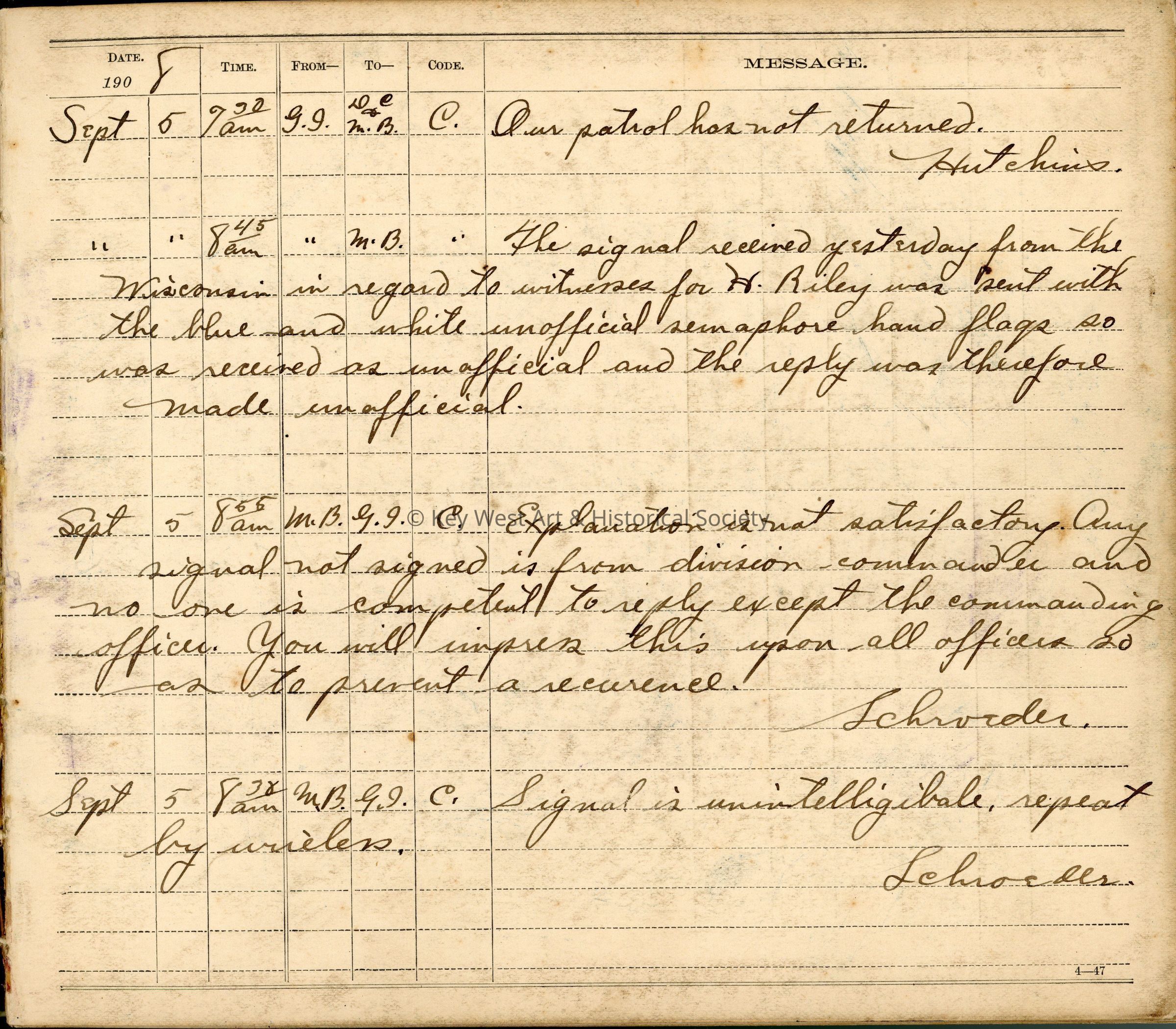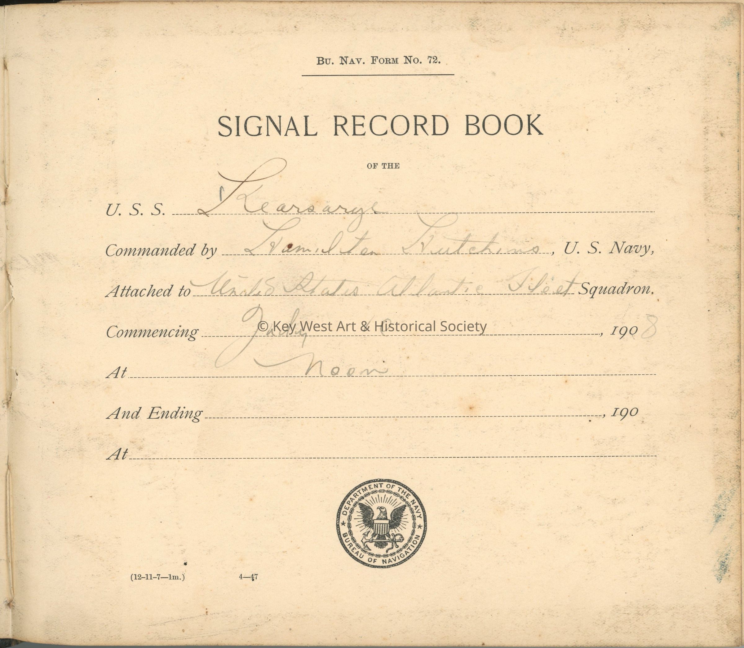 Two black U.S. Navy Signal Record Books that have been attached to each other. They log all "signals of an official nature and all official megaphone or word of mouth messages." The record books are "furnished by the Bureau of Navigation to all vessels in commission." These particular record books kept log of signals made to and from the USS KEARSARGE between July 10, 1908 and November 13, 1908. The KEARSARGE was commissioned in February 1900 and became part of the Great White Fleet.Collection