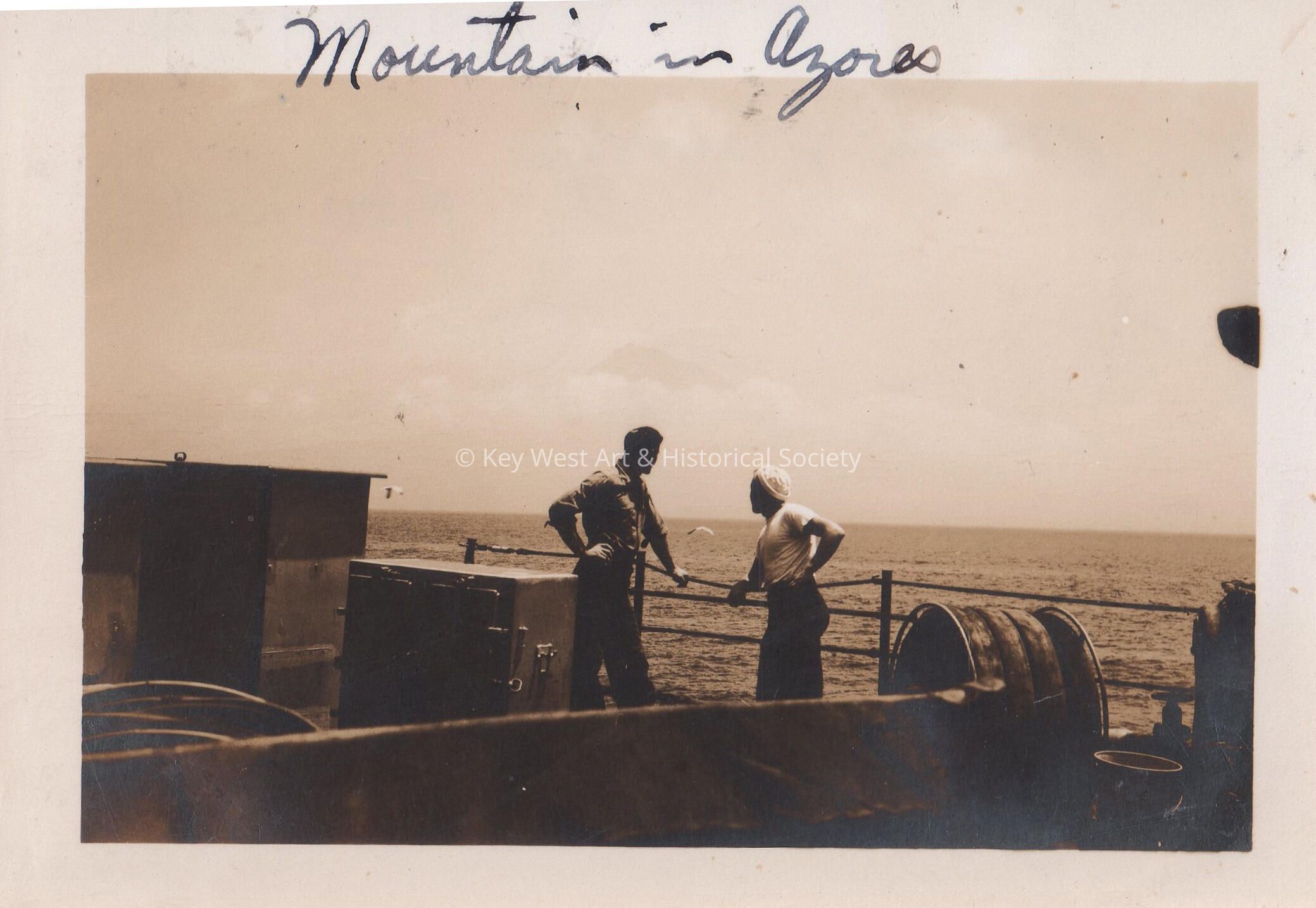 Black and white photograph from the deck of the USS KEY WEST (PF-17) during World War II. Caption reads, 'Mountain in Azores'. Notation on verso, 'Polowski and Shorty'.