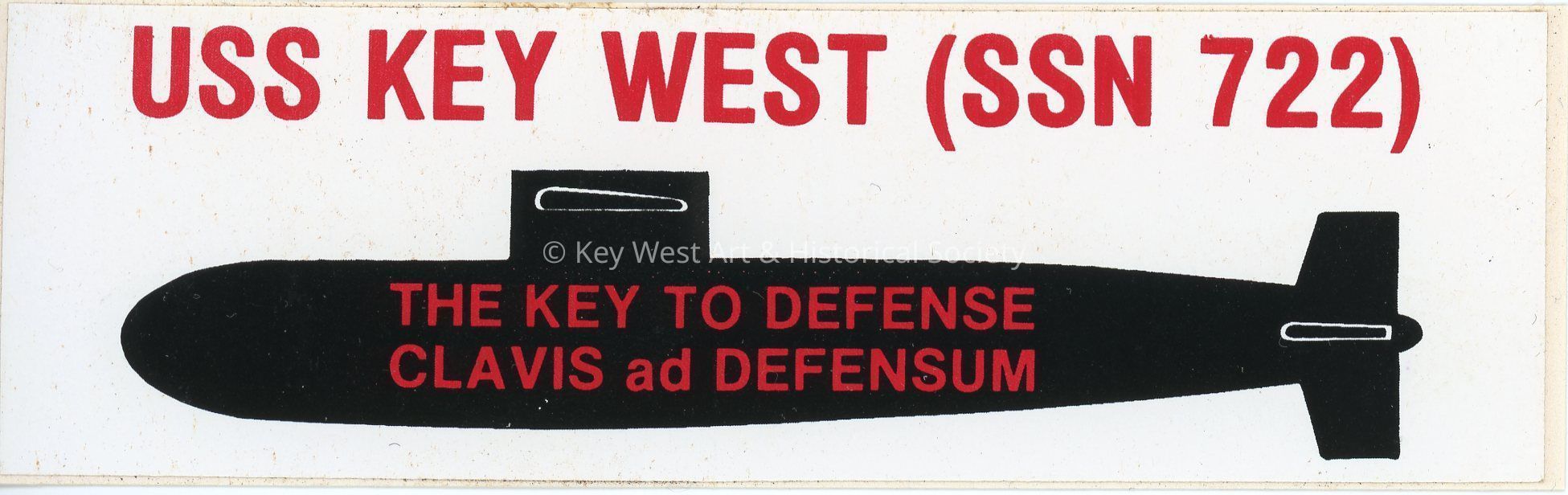 A rectangular sticker for the submarine USS KEY WEST (SSN 722). The sticker has a black submarine with the motto 'Clavis ad Defensum,' which translates to 'The Key to Defense.'Collection