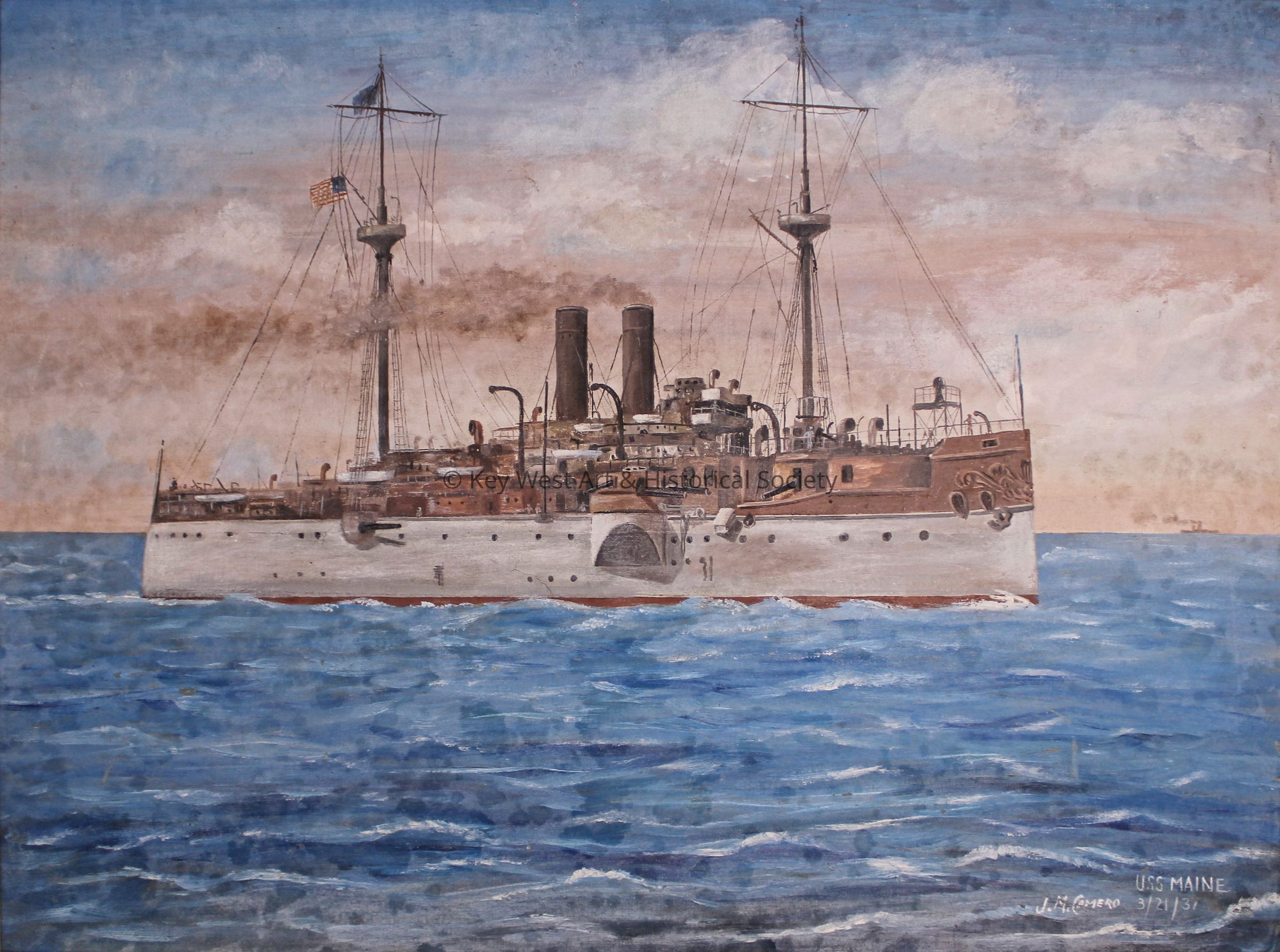 Oil painting on canvas of the USS MAINE at sea by Manuel Camero. The ship is shown in profile, emphasizing its formidable structure, equipped with multiple masts and twin funnels releasing smoke. The sky behind the ship features a gradient of brown and beige, perhaps indicative of a setting sun.Type of Painting