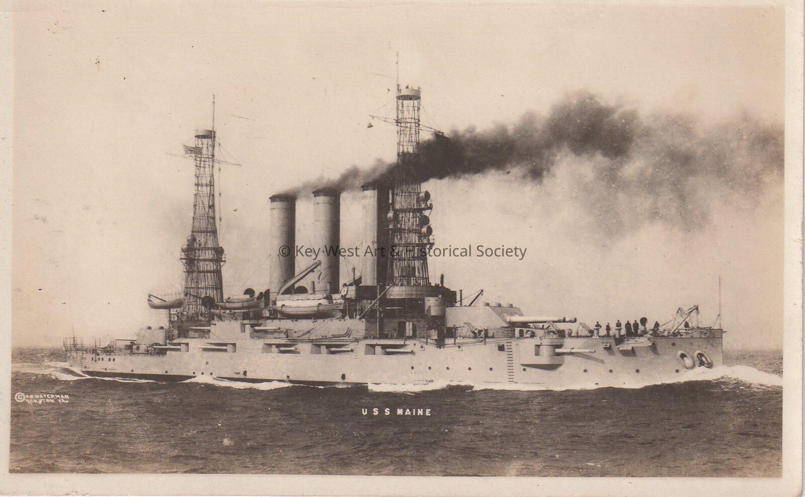 Postcard depicting the battleship USS MAINE (BB-10) underway in Hampton, Virginia. The caption reads, ‘U.S.S. Maine’.Subject Person/Organization