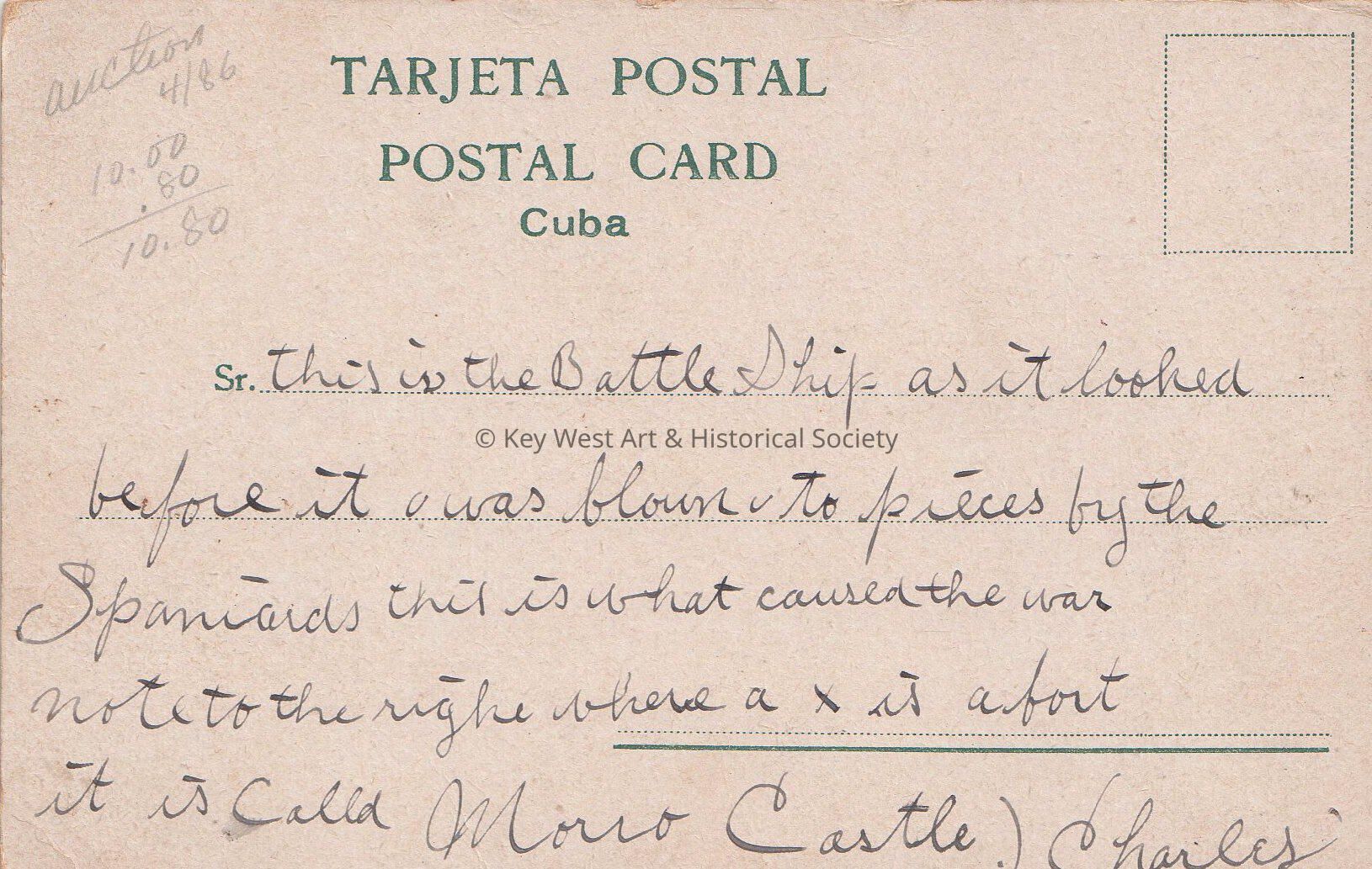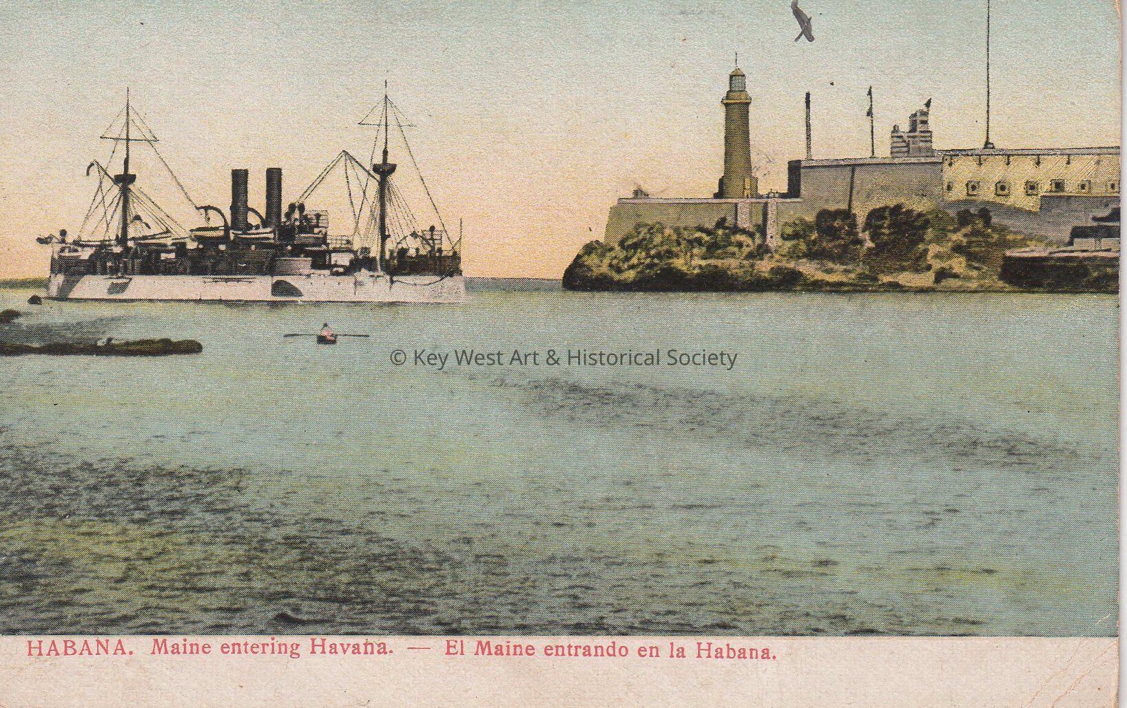 Postcard depicting the USS MAINE passing Morro Castle in Havana Harbor. The caption reads, ‘Habana. Maine entering Habana - El Maine entrando en la Habana'.Subject Place
