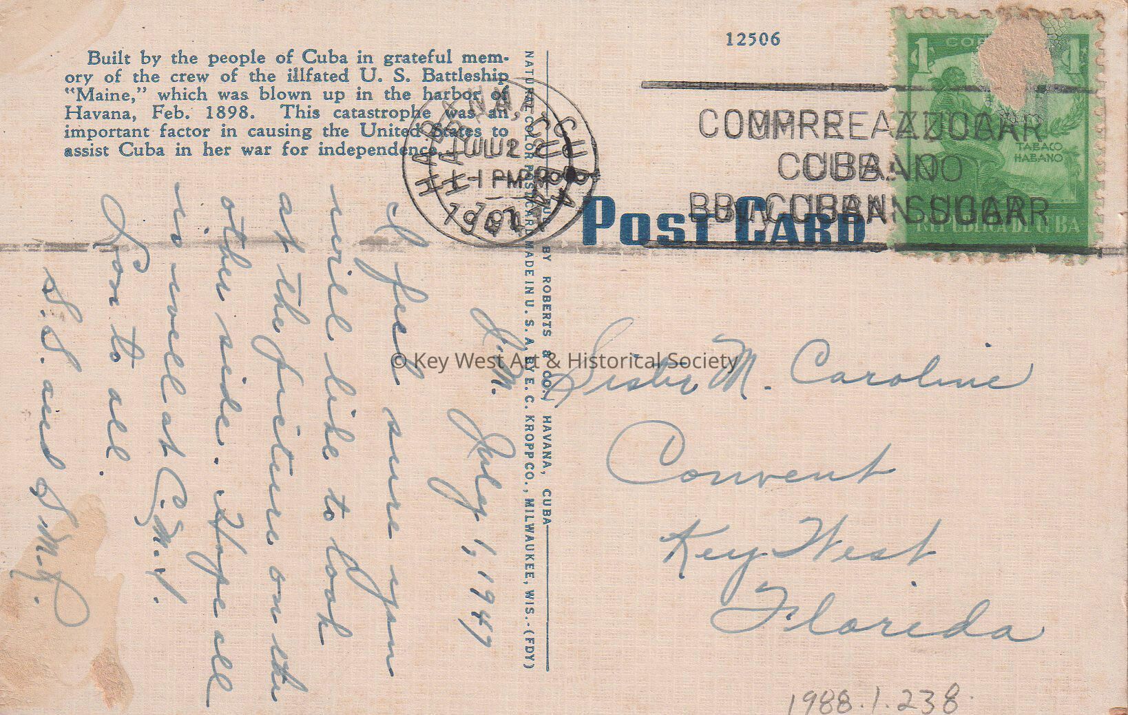 Postcard depicting the USS MAINE memorial monument in Havana, Cuba. The caption reads, ‘USS Maine Monument, Havana, Cuba’. Notation on verso, ‘Built by the people of Cuba in grateful memory of the crew of the ill-fated U. S. Battleship “Maine” which was blown up in the harbor of Havana, February, 1898. This catastrophe was an important factor in causing the United States to assist Cuba in her war for independence.’ The message on the verso reads, ‘July 1, 1947, I feel sure you will like to look at the picture on the other side. Hope all is well at C.M.I. Love to all, S.S. and S.M.R.’ The postcard is addressed to Sister M. Caroline, Convent, Key West, Florida, and is postmarked Havana, Cuba July 2, 1947.Subject Place