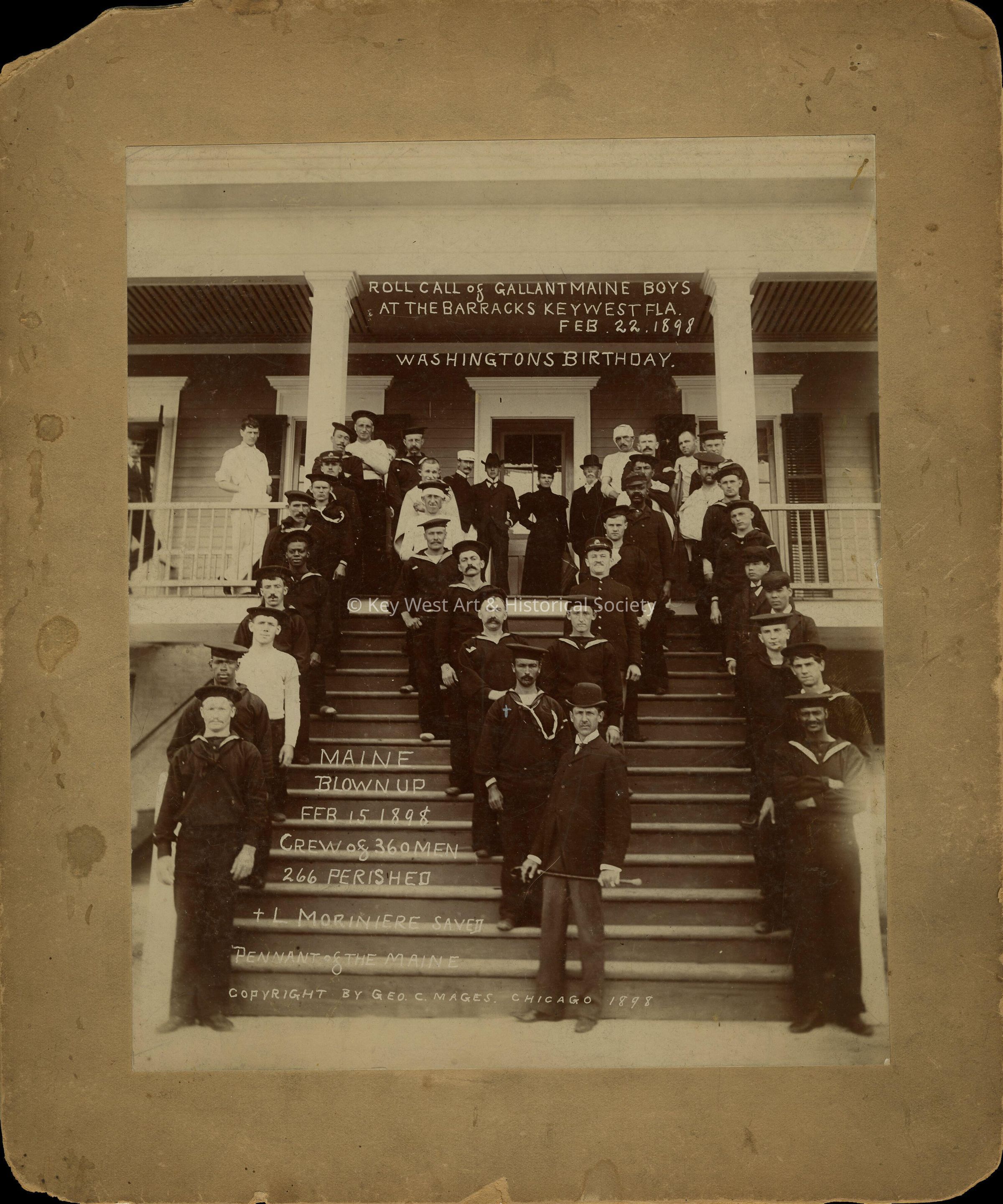 A photograph of the USS MAINE sailors at the Key West Barracks taken on February 22, 1898. Caption reads, 'Roll Call of Gallant Maine Boys at the Barracks Key West Fla. Feb. 22, 1898. Washington's Birthday. Maine blown up Feb. 15 1898. Crew of 360 men, 266 perished + L Moriniere [Louis Moriniere, seaman] saved pennant of the Maine.'Photograph Details