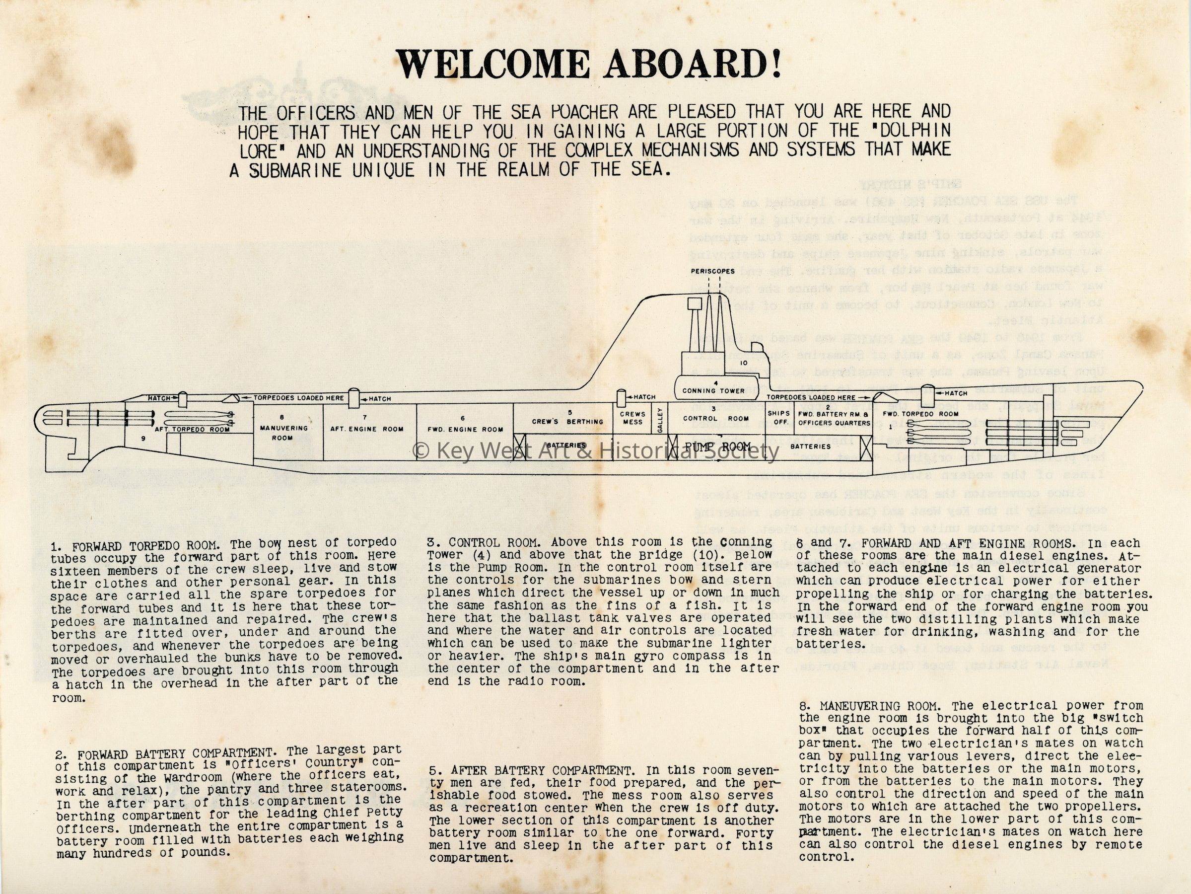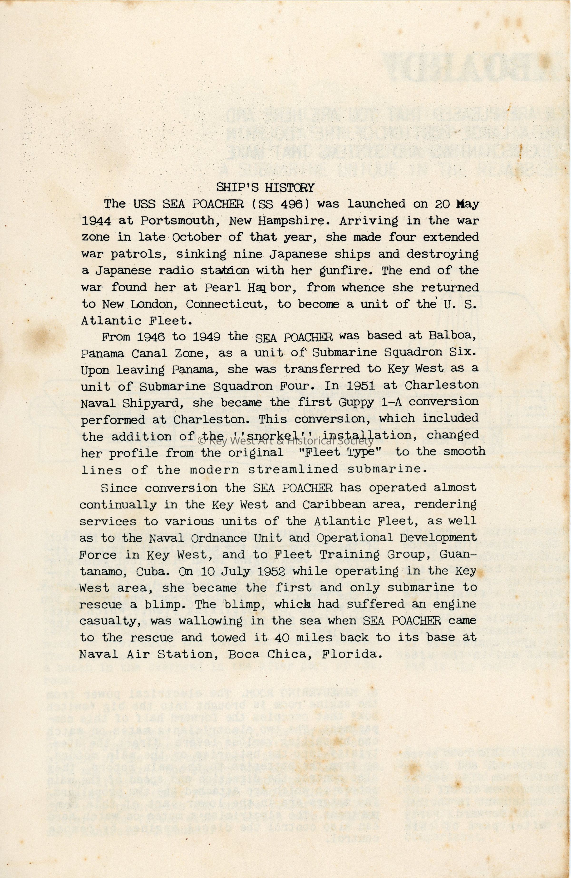 Pamphlet describing the USS SEA POACHER-SS 406, a Balao class submarine which launched on May 20, 1944. The SEA POACHER was one of the submarines on view for visitors on Armed Forces Day 1962 at Naval Station Key West.Collection