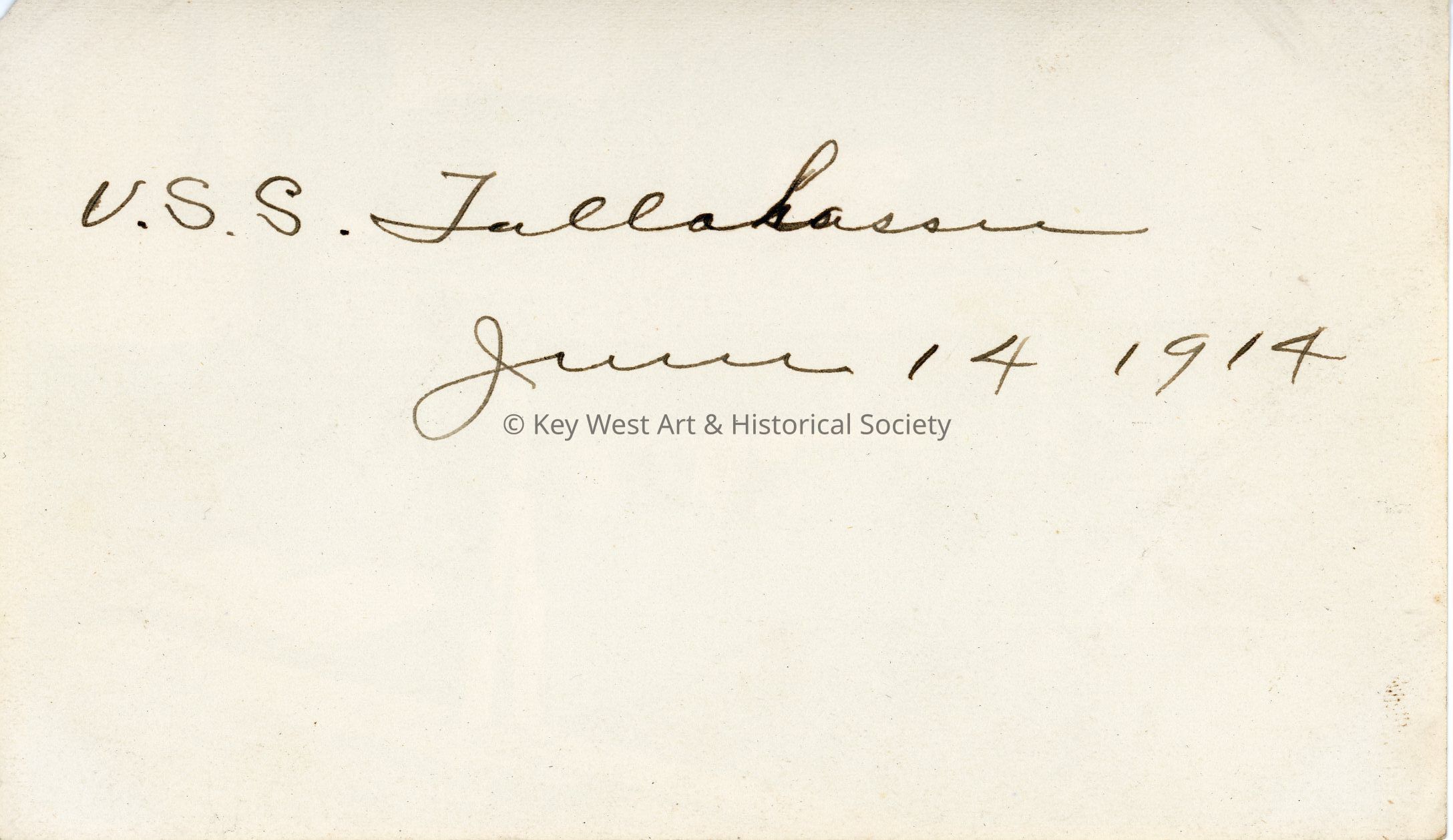 Black and white photograph depicting an unknown man standing in front of the Navy submarine tender USS TALLAHASSEE (BM-9). The photograph was designed to be attached to a postcard backing.