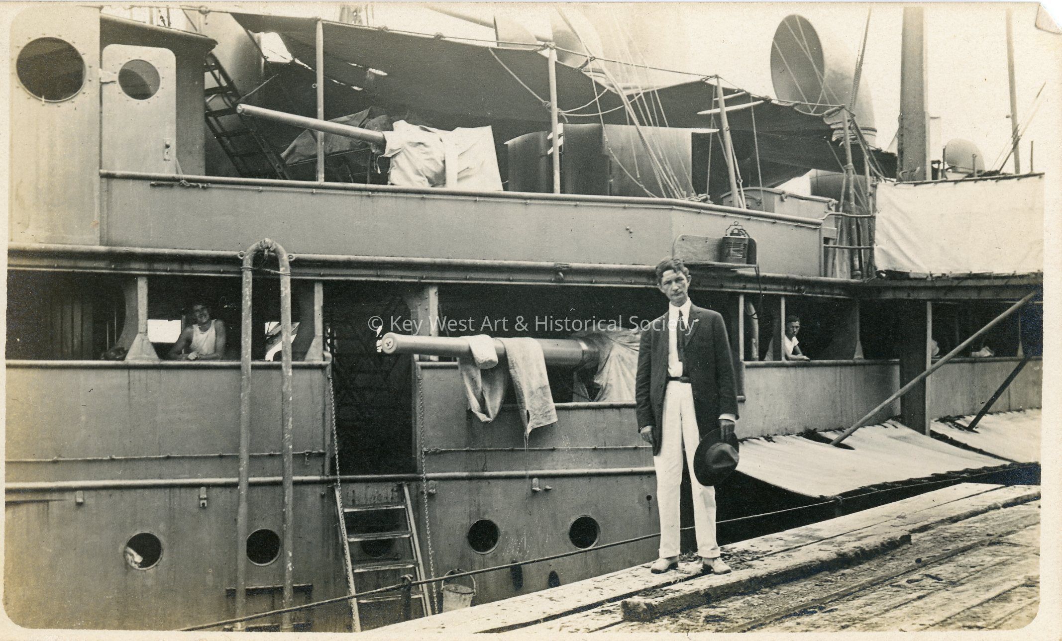 Unknown Man in front of the USS TALLAHASSEE (BM-9)