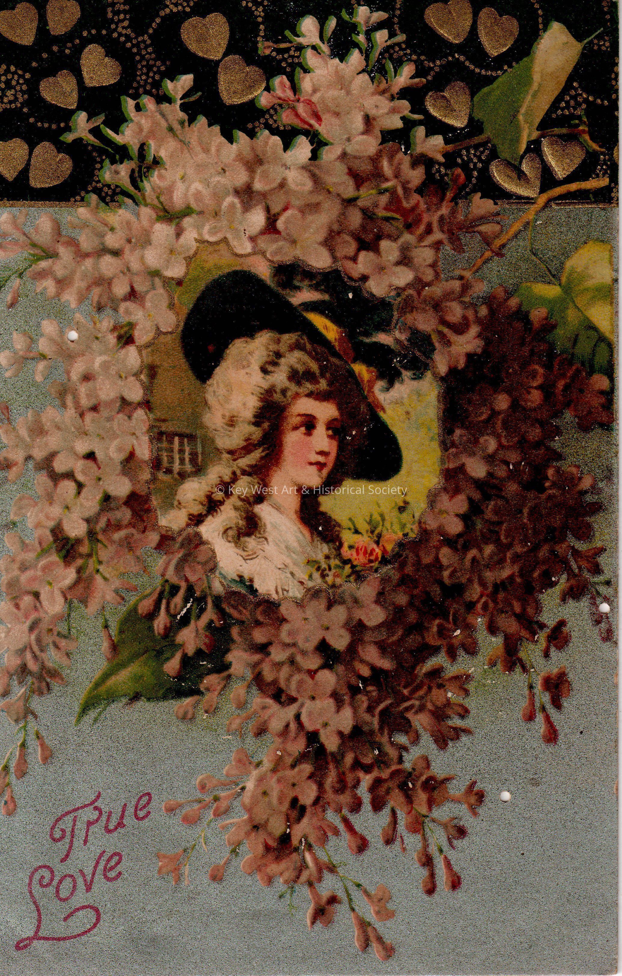 Postcard depicting a woman in a hat surrounded by flowers. The caption reads, ‘True Love’. The message on the verso reads, ‘To Carrie with love and best wishes from Lill, February 14, 1909'. The card is addressed to Mrs. J.W. Hattrick, 2113 Manton Street, Station D, Philadelphia, Pennsylvania.Collection