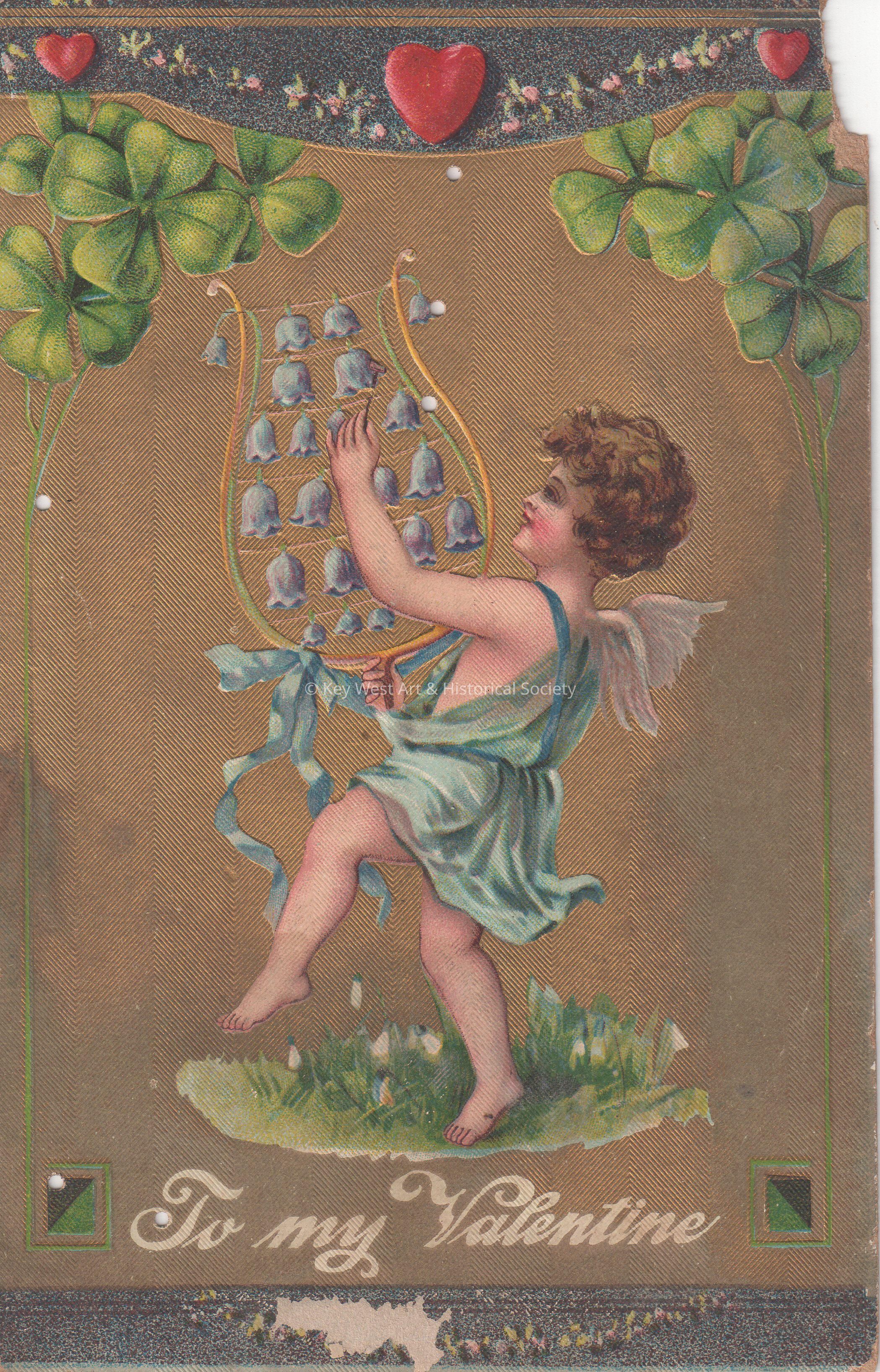 Postcard depicting cupid with bells, hearts, and shamrocks. The caption reads, ‘To my Valentine’.Collection