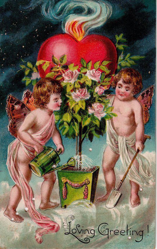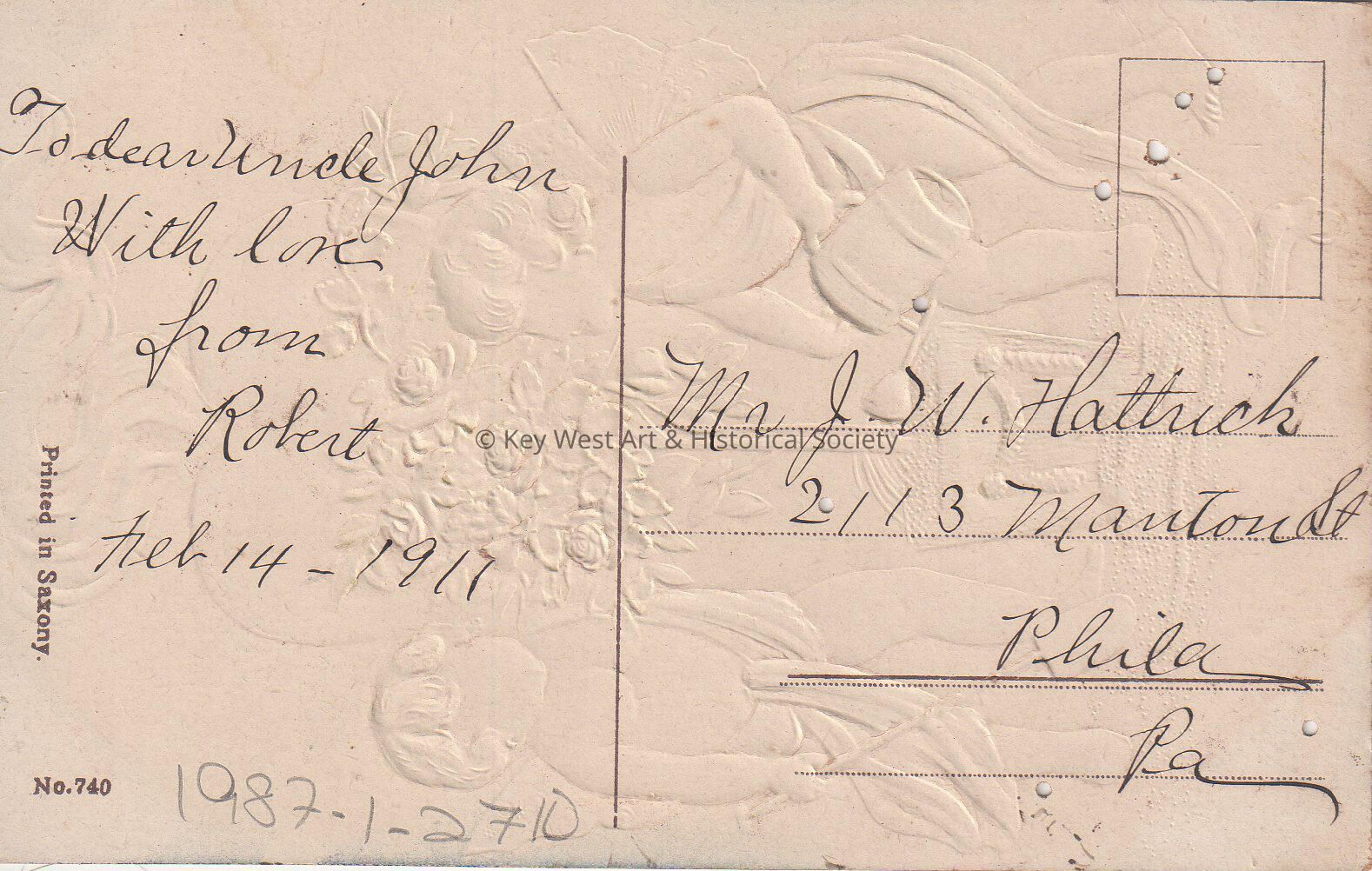 Postcard depicting cupids with a heart and flowers. The caption reads, ‘Loving Greeting!’ The message on the verso reads, ‘To dear Uncle John with love from Robert, February 14, 1911'. The card is addressed to Mr. J.W. Hattrick, 2113 Manton Street, Philadelphia, Pennsylvania.Collection