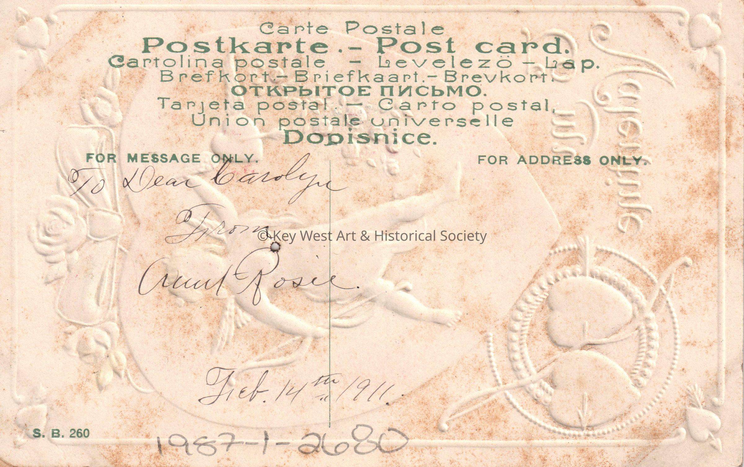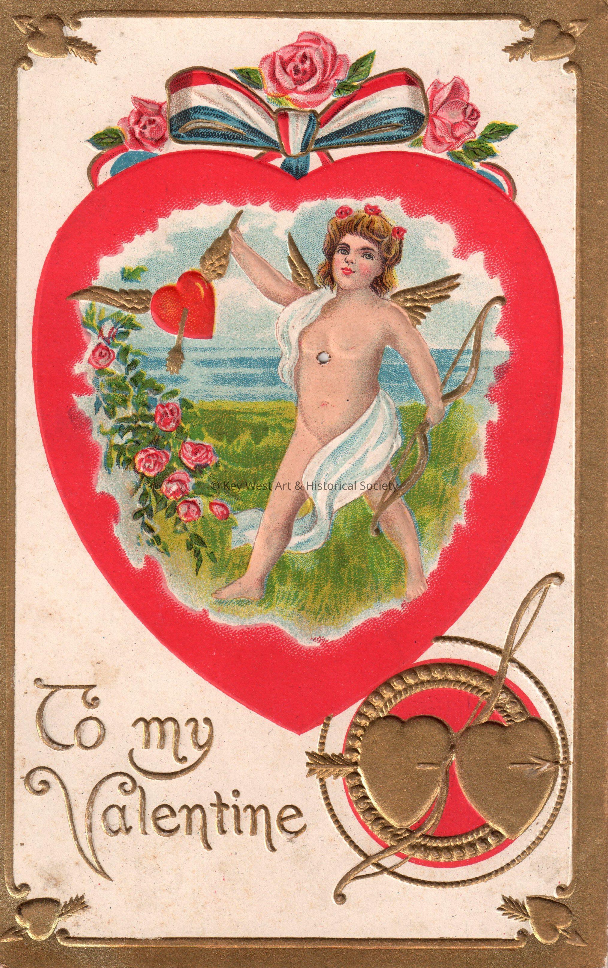 Postcard depicting cupid with a bow, arrows, and hearts. The caption reads, ‘To my Valentine’. The message on the verso reads, ‘To dear Carolyn, from Aunt Rosie, February 14, 1911’.Collection