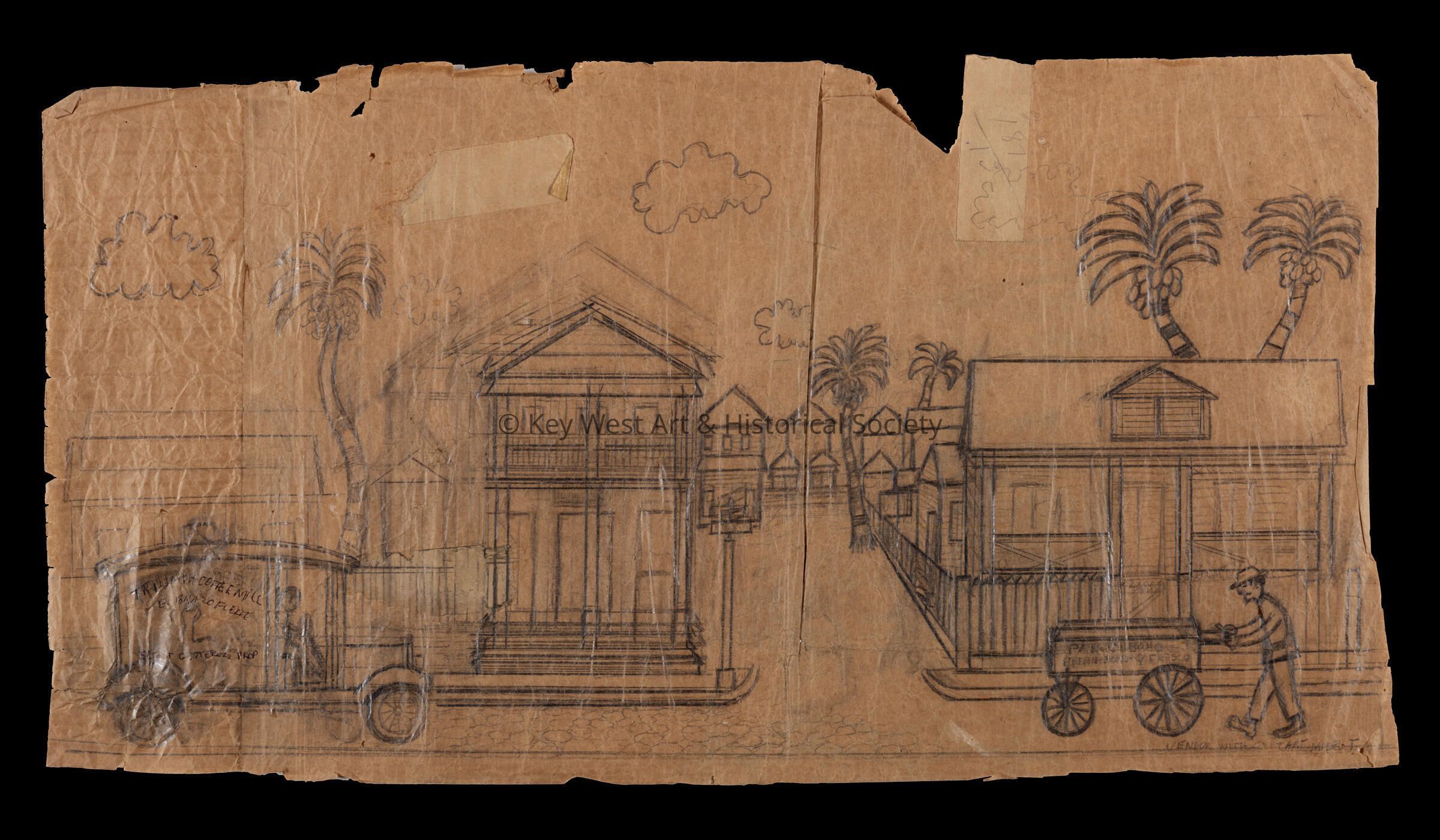 Pencil sketch on an unfolded paper bag by Mario Sanchez depicting two street vendors - Triumph Coffee Mill El Brazo Fuerte in a Model T car and a Pan Cubano cart pushed by a vendor. passing Miguel's Barber Shop. There is an unfinished sketch on the verso depicting a band on stage.Type of Drawing