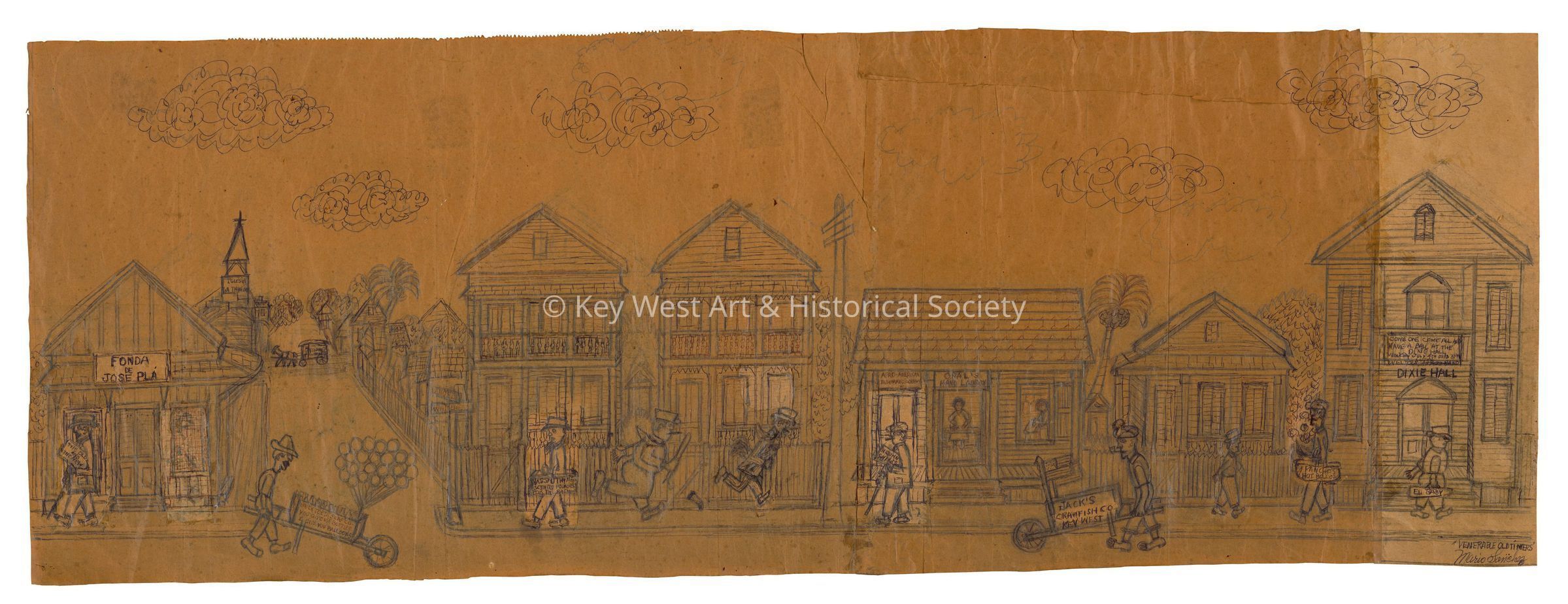 Paper bag drawing by Mario Sanchez depicting a street scene with many of his typical characters including the Chicken Thief and the police man, Buckteeth Bottle Swap Co with his balloons, Crawfish Jack, Jefferson B. Browne and Pancho's Hot Bollos. Caption provided in file. Matches intaglio 1987.01.3234.Type of Drawing