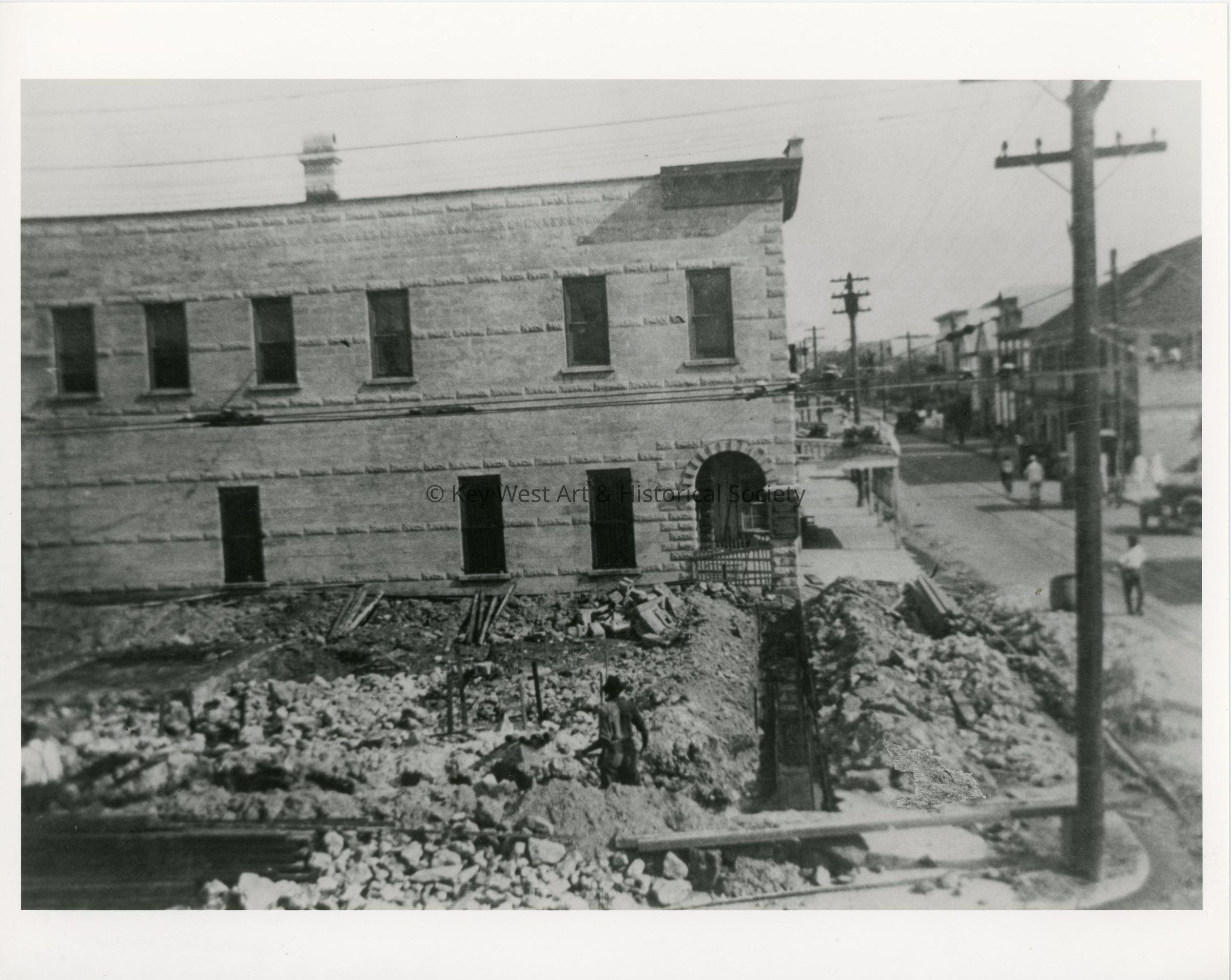 Black and white photograph of the Victoria Restaurant (present day Sloppy Joe's Bar) at 201 Duval Street under construction.