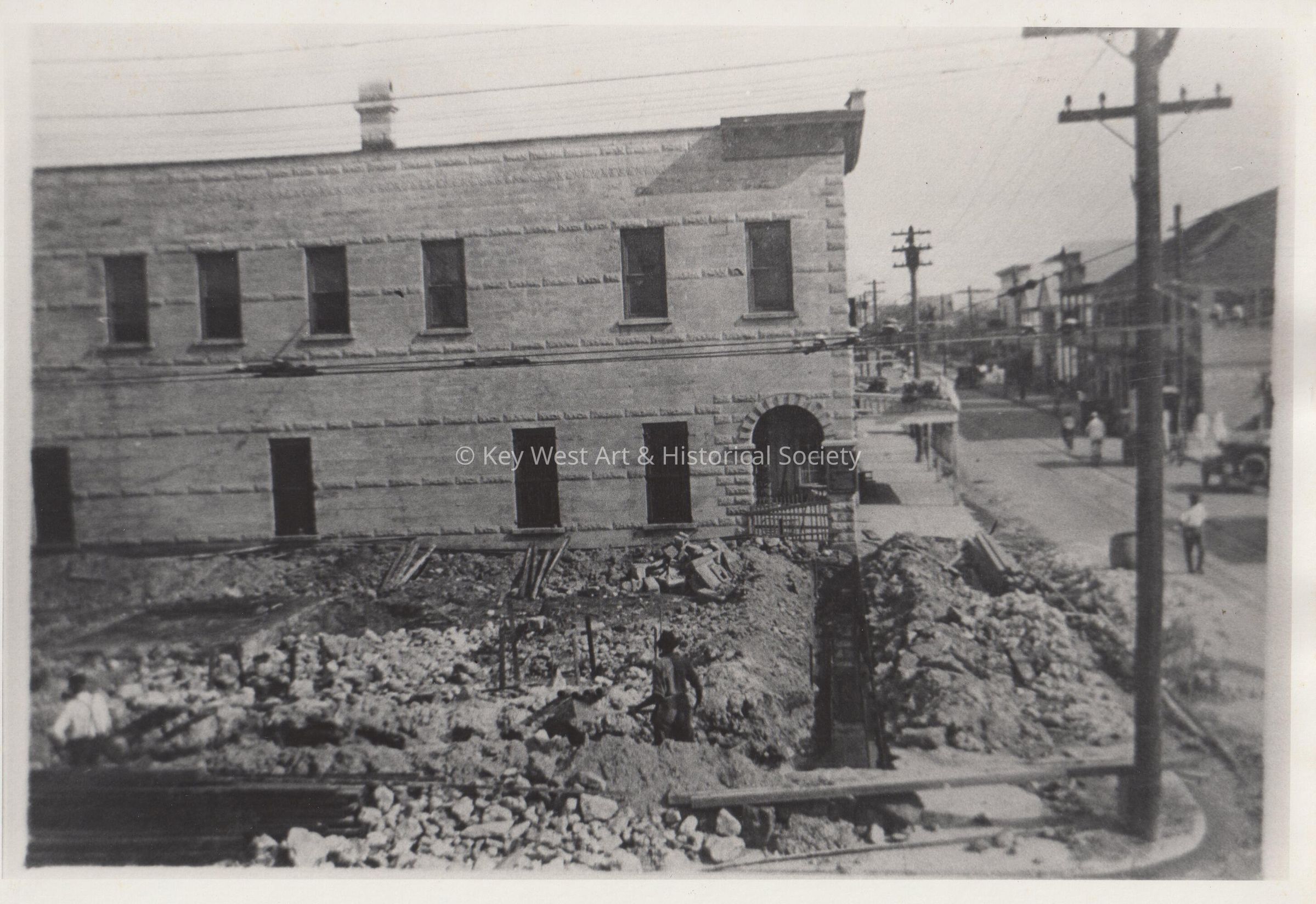 Black and white photograph taken during the construction of the Victoria Restaurant at 201 Duval Street (present day location of Sloppy Joe's Bar).
