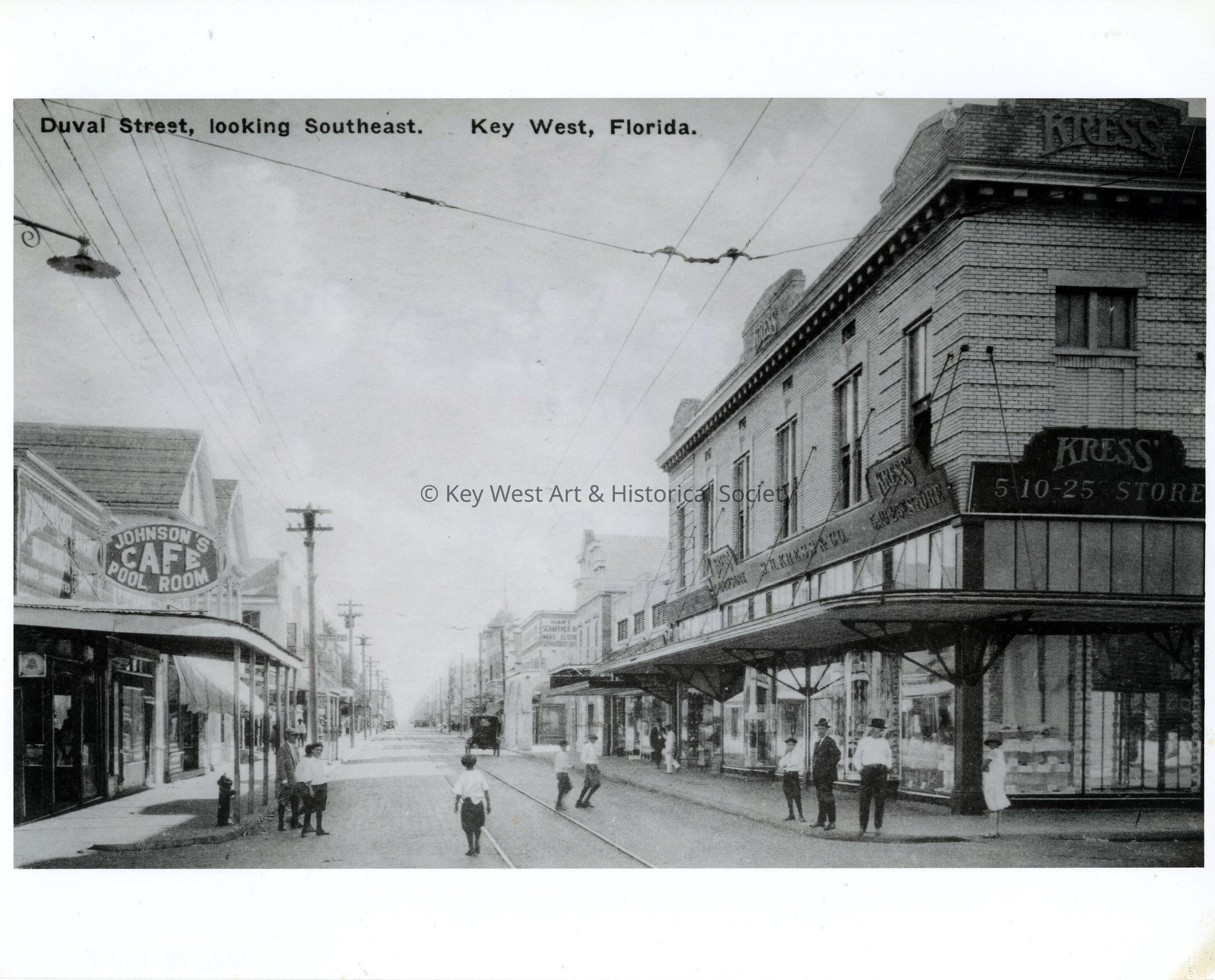 Black and white photograph of a postcard showing a south view down the 500 block of Duval Street. The Kress Building and Johnson's Cafe and Pool Room are seen. Notation reads, 'Duval Street, looking Southeast, Key West, Florida'.Photograph Details