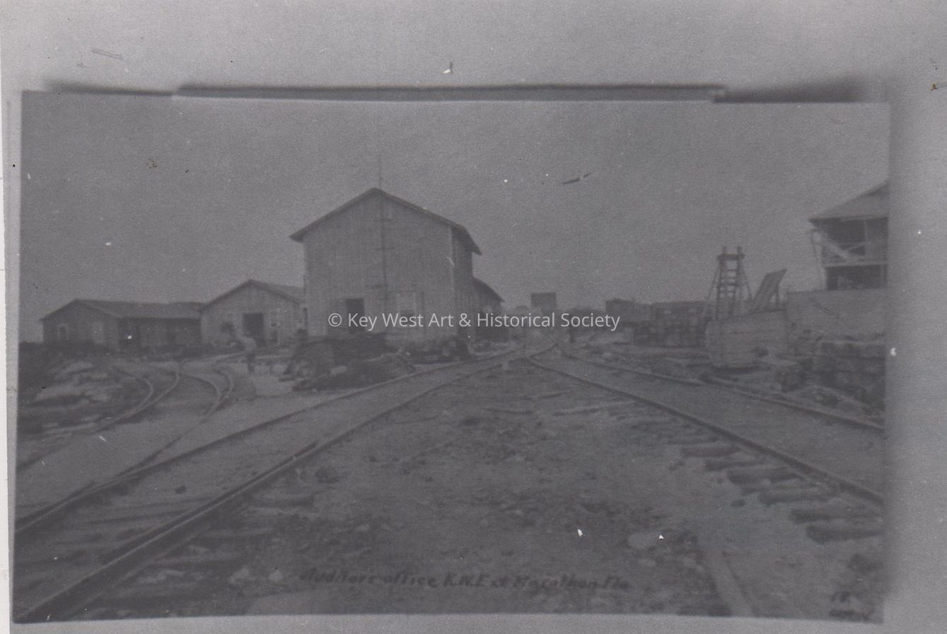 Black and white photograph of the Marathon Dock. Storehouses are visible on the left, the accounting office is in the left center and the Marathon Hotel is barely visible on the right.
