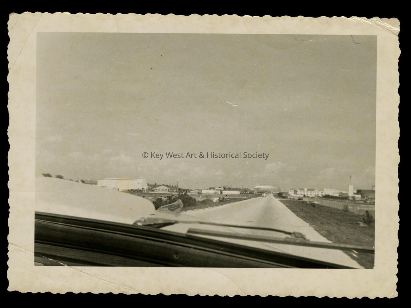 Black and white photograph taken from a vehicle traveling on the Overseas Highway. Dirigible at Naval Air Station Key West is visible in background.