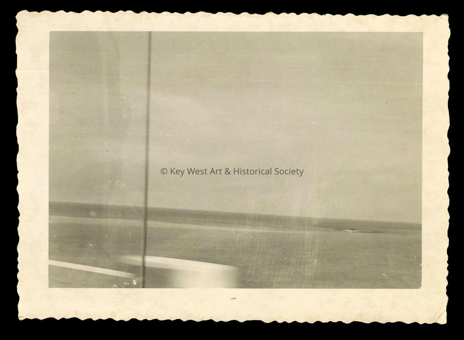 Black and white photograph taken from a vehicle traveling on the Overseas Highway.