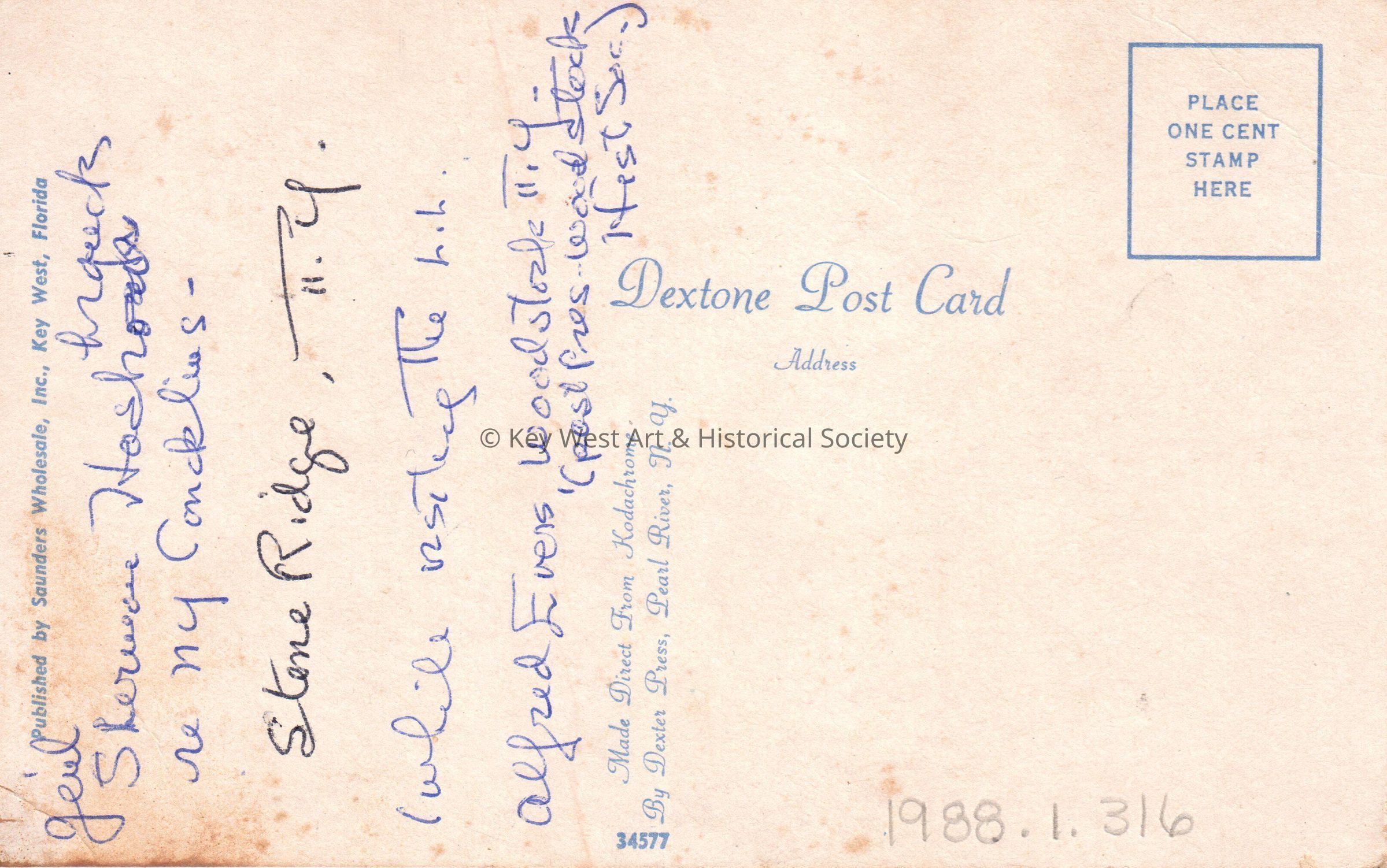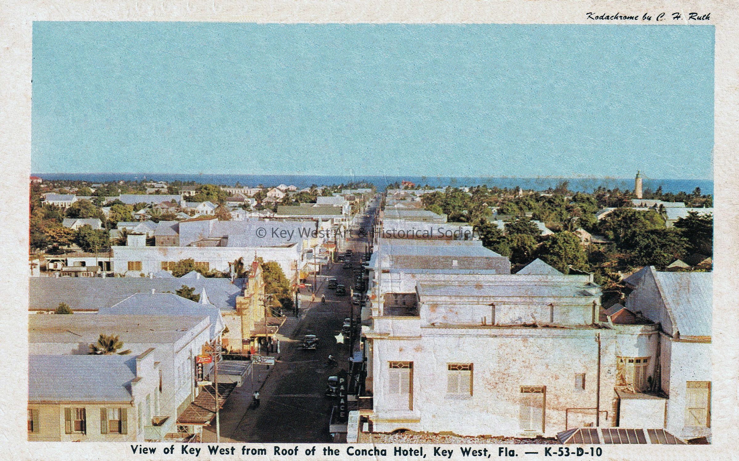 Postcard depicting a rooftop view of Duval Street looking south with the Lighthouse and Atlantic Ocean in the background. The caption reads, ‘View of Key West from the roof of the Concha Hotel, Key West, Florida’. The message on the verso reads, ‘Geul, Sherwee Hoeherquects regarding New York Conklius, Stone Ridge, New York, while resting the h.h., Alfred Evers, Woodstock, New York (past President of Woodstock Historical Society).’Collection
