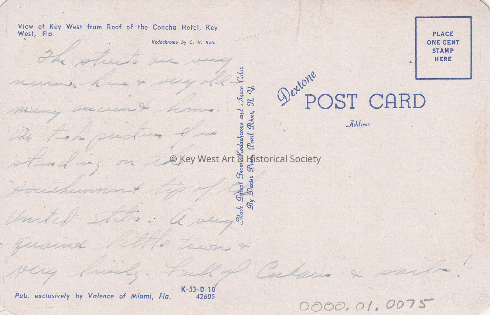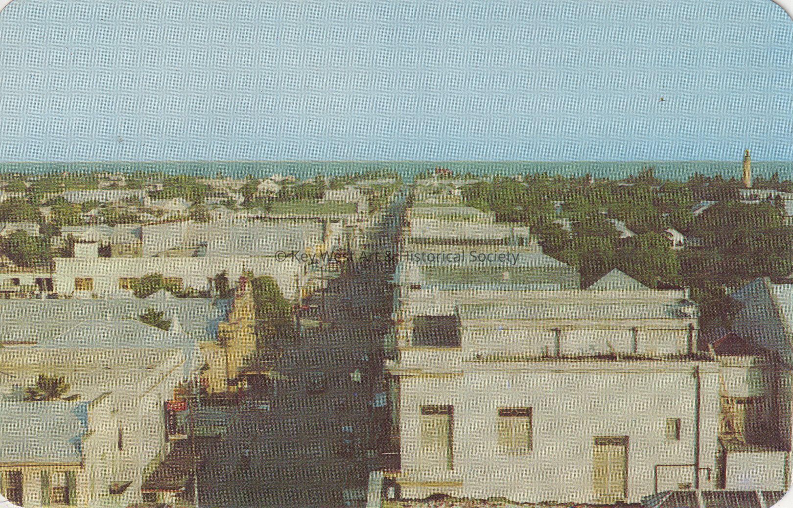 Postcard depicting Duval Street looking south taken from the rooftop of the La Concha Hotel with the Lighthouse and Atlantic Ocean in the background. The description on the verso reads, ‘View of Key West from the roof of the Concha Hotel, Key West, Florida’. The message on the verso reads, ‘The streets are very narrow here and very old - many ancient homes. We took pictures of me standing on the southernmost tip of the United States. A very quaint little town and very lively. Full of Cubans and sailors.’Collection