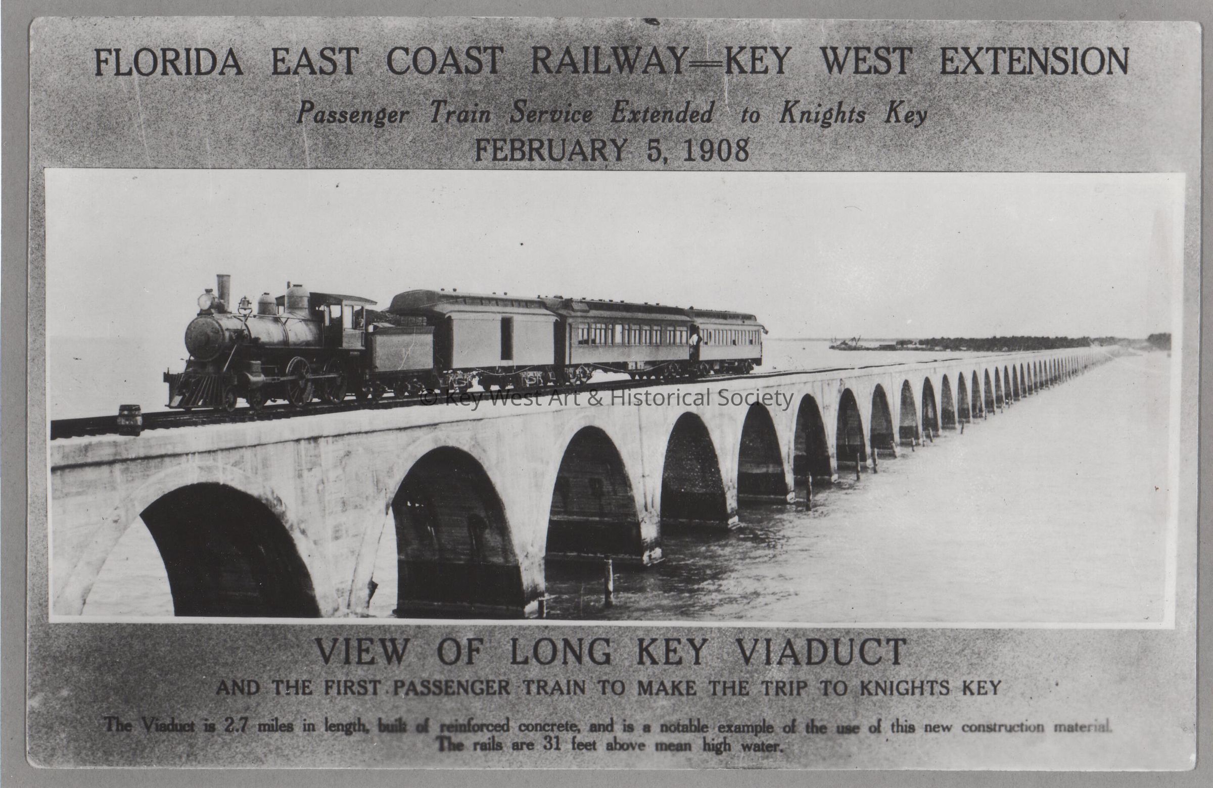 Black and white photograph of a Florida East Coast Railway train crossing Long Key Viaduct. Caption reads, 'Florida East Coast Railway - Key West Extension. Passenger train service extended to Knights Key February 5, 1908. View of Long Key Viaduct and the first passenger train to make the trip to Knights Key. The Viaduct if 2.7 miles in length, built of reinforced concrete, and is a notable example of the use of this new construction material. The rails are 31 feet above mean high water.'Photograph Details