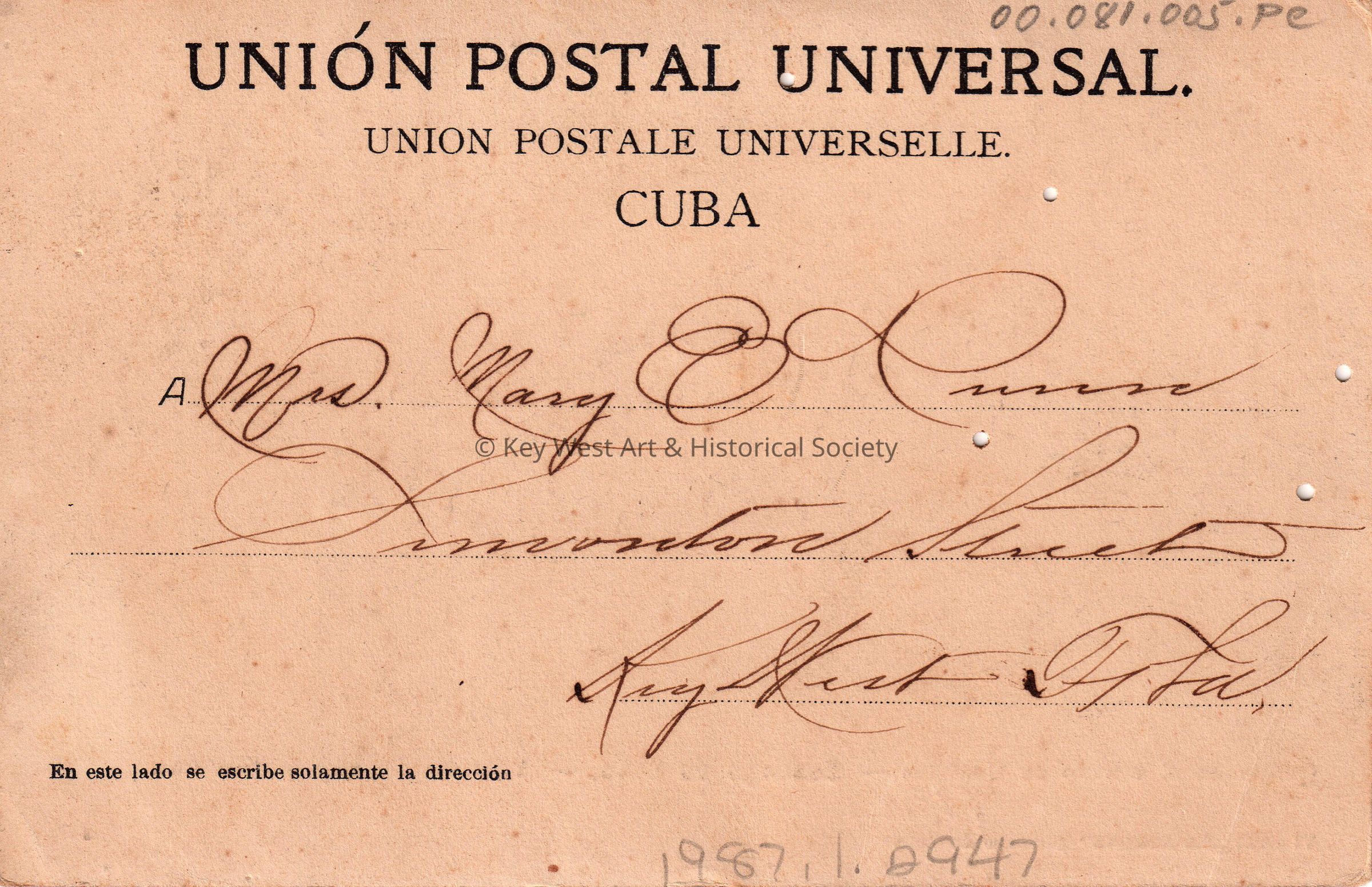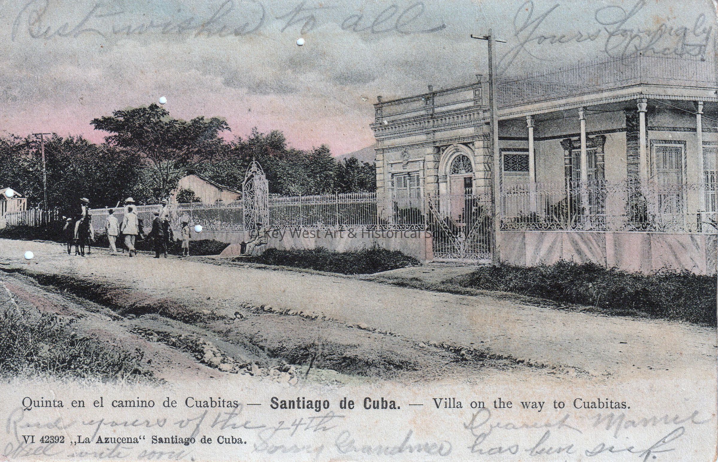 Postcard depicting a gated home. The caption reads, ‘Quinta en el camino de Cuabitas – Santiago de Cuba – Villa on the way to Cuabitas. La Azucena’. The message written on the front of the card reads, ‘Best Wishes to All, Yours Lovingly, Dearest Mamie, Received yours of the 24th. Will write soon. Sorry Grandma has been sick.’ The description on the verso reads, ‘Union Posta Universal, Cuba.’ The card is addressed to Mrs. Mary Dunn, Simonton Street, Key West, Florida.Collection