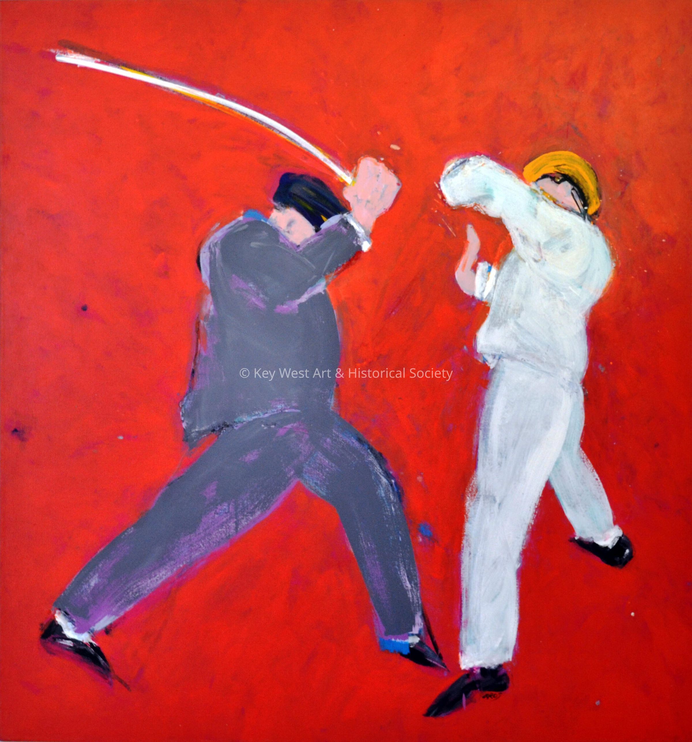 Acrylic on canvas painting by Fred Gros depicting an unarmed man being attacked by another man wielding a sword.Type of Painting