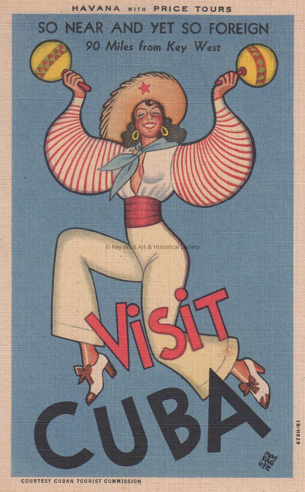 Postcard depicting a Cuban woman dancing with maracas. The caption reads, ‘Havana with Price Tours; So near and yet so foreign. 90 miles from Key West – Visit Cuba.’