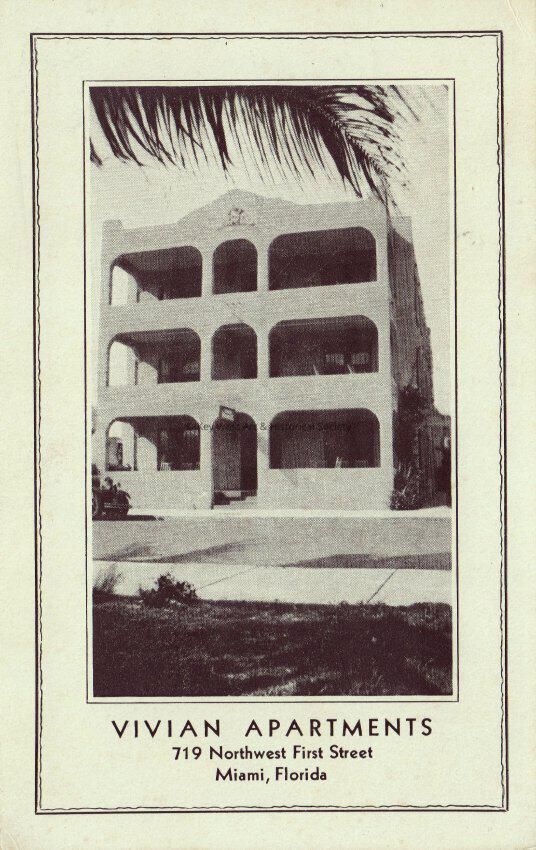 Postcard depicting an apartment building. The caption reads, ‘Vivian Apartments, 719 Northwest First Street, Miami, Florida.’Collection