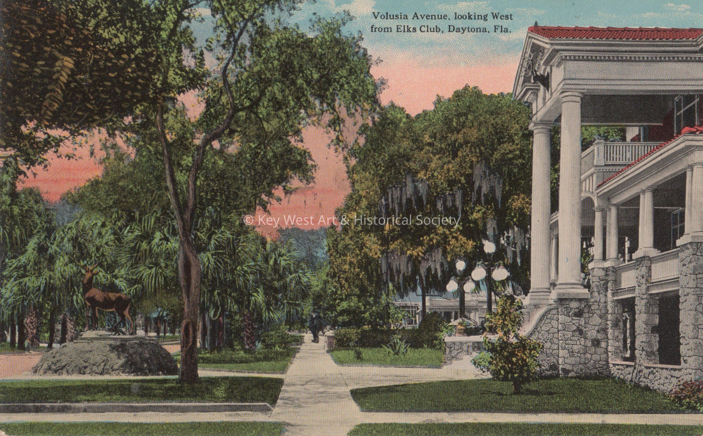 Postcard depicting an Elk statue, buildings, sidewalks, and foliage. The caption reads, ‘Volusia Avenue, looking West from Elks Club, Daytona, Florida.’Collection