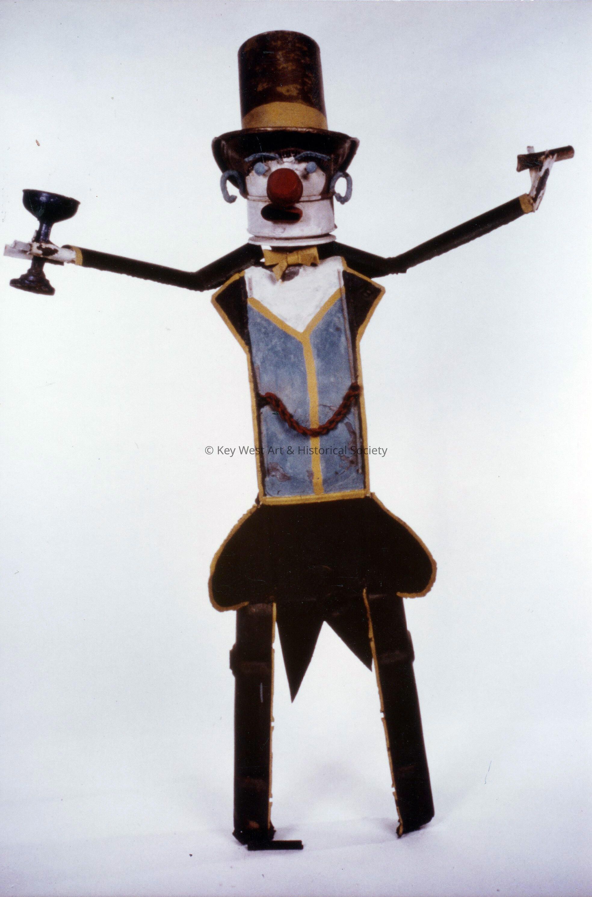 Freestanding sculpture by Stanley Papio depicting actor W.C. Fields. The actor is wearing a tuxedo, blue vest and a top hat. The arms are extended to the side. He holds a cigar in his left hand and a purple cocktail glass in his right. The torso is a fuel tank, his legs are manifold covers and his watch chain is steel.Type of Sculpture