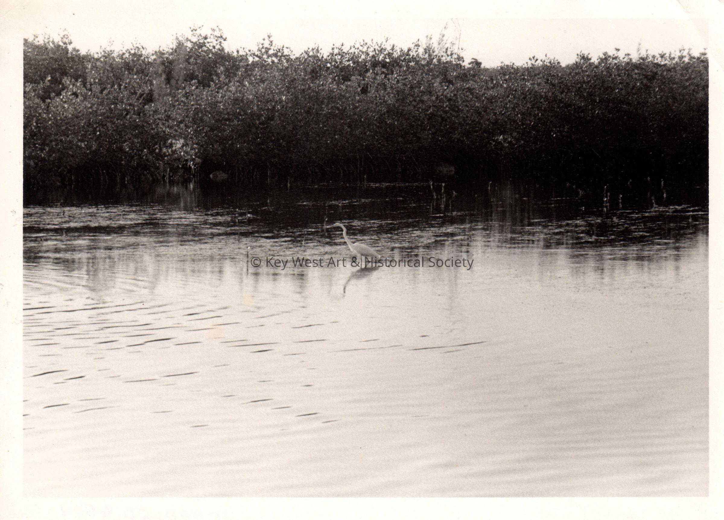 Black and white photograph of an egret wading near mangroves.