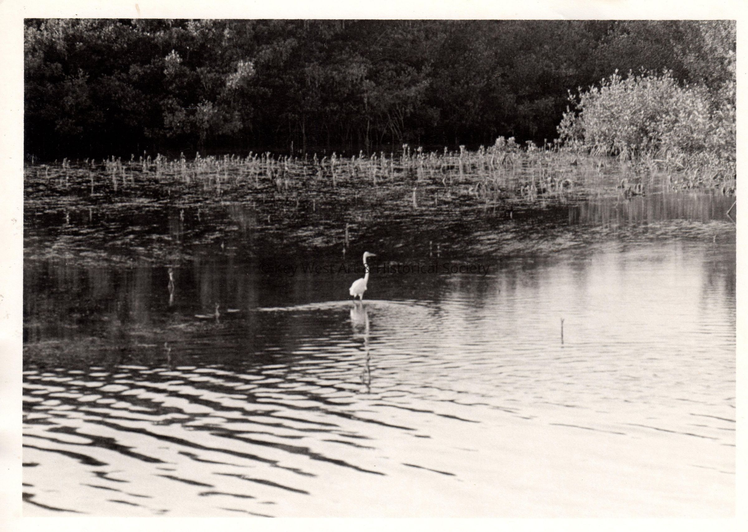 Black and white photograph of an egret wading near mangroves.