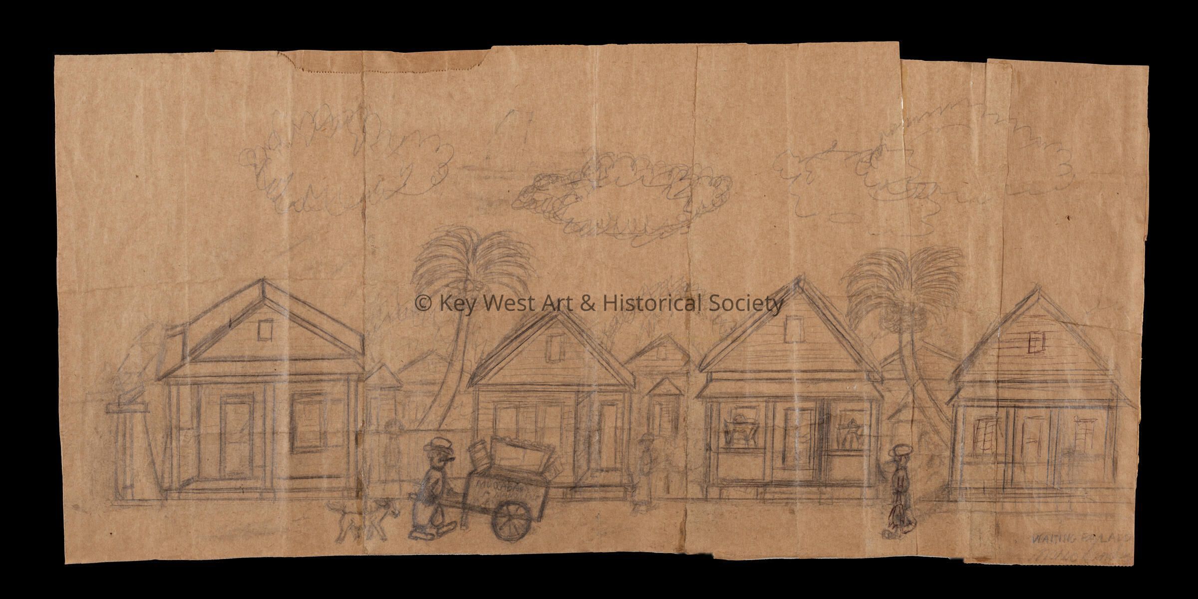 Pencil sketch on an unfolded paper bag by Mario Sanchez depicting a street scene which includes a vendor with his cart and man carrying fresh fish.Type of Drawing