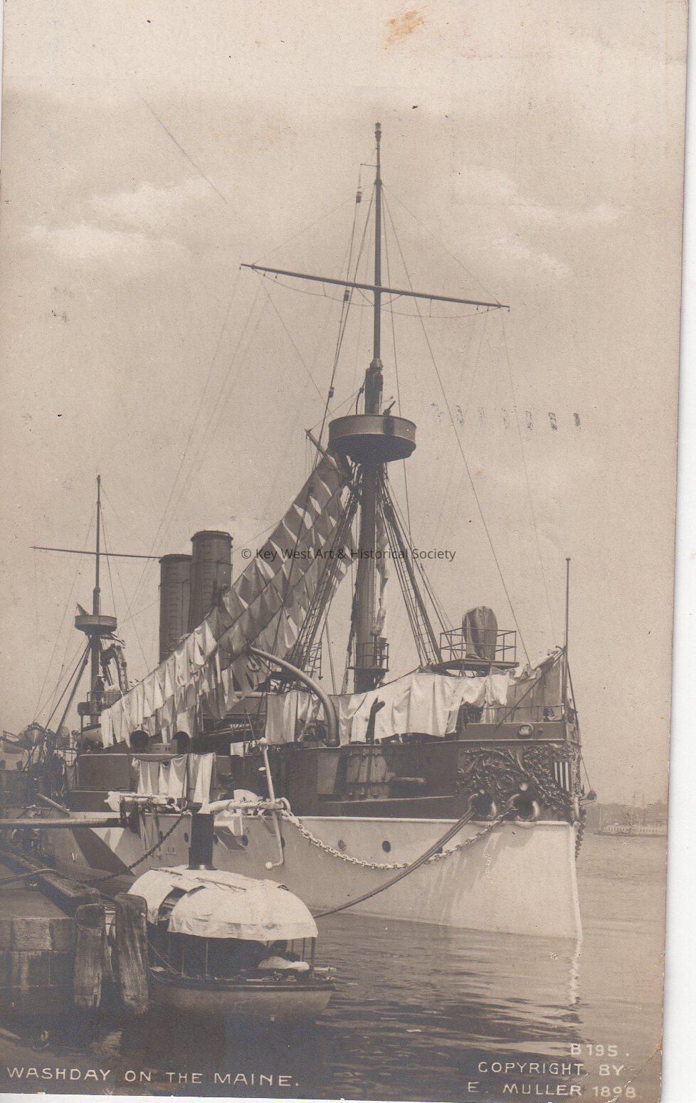 Postcard depicting a ship with clothing drying on its lines. The caption reads, ‘Washday on the Maine.’Collection